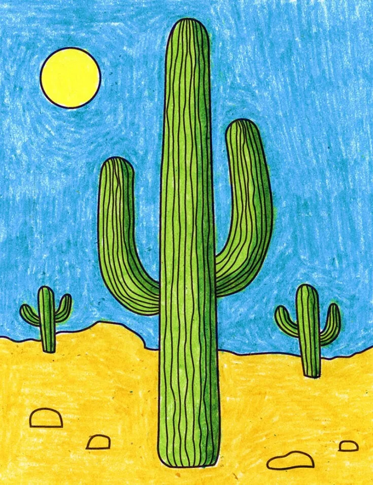 Sketching a cactus is one of my favorite ways to work on freehand lines without any pressure. The natural rib lines on actual cactuses are far from straight, so the wobblier your lines are, the better! Experiment with different shapes and sizes or branch out by drawing a desert scene with lots of cacti!