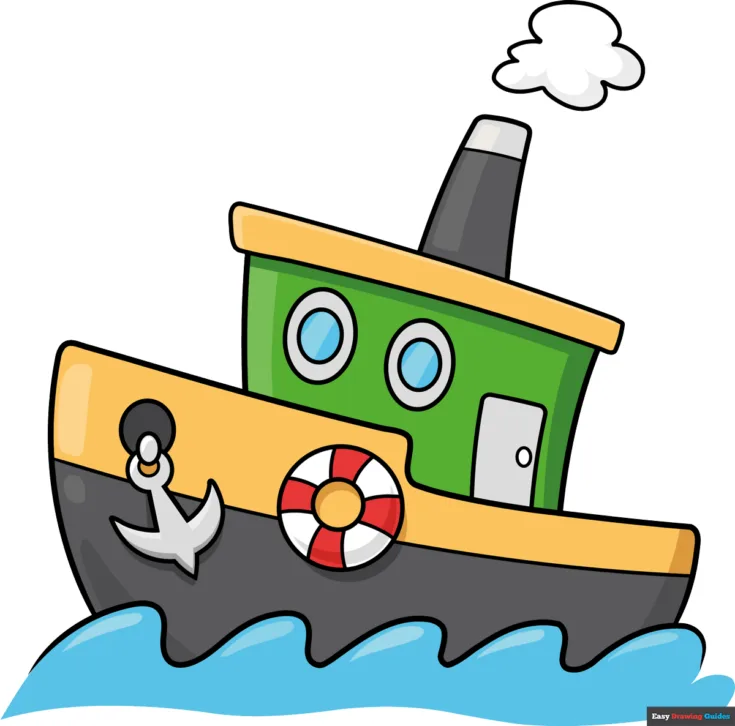 Set sail on the high seas with this easy cartoon boat sketch. There are plenty of elements like portholes, funnels, and anchors for you to experiment with. This drawing introduces us to motion in a straightforward way. Believe it or not, the angle of the boat and the direction of the waves is all we need to bring this voyage to life!