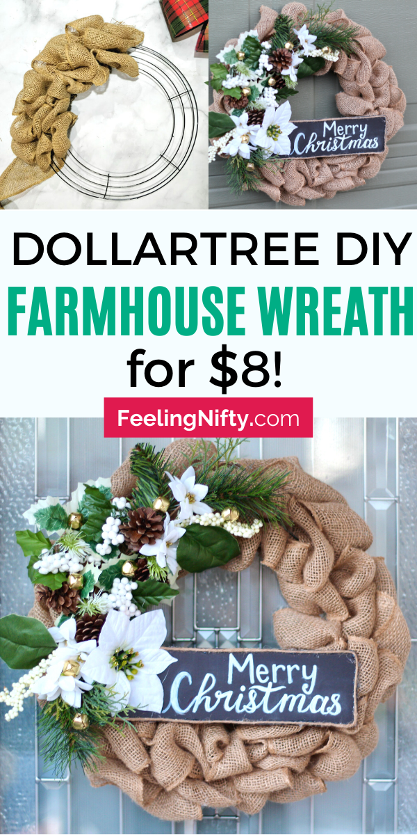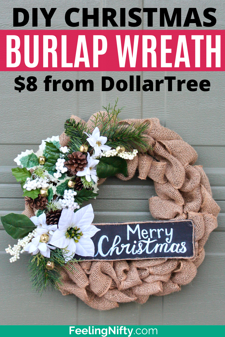 Make your own on-trend DIY Burlap Christmas wreath with Dollarstore/Dollartree finds for only $8.