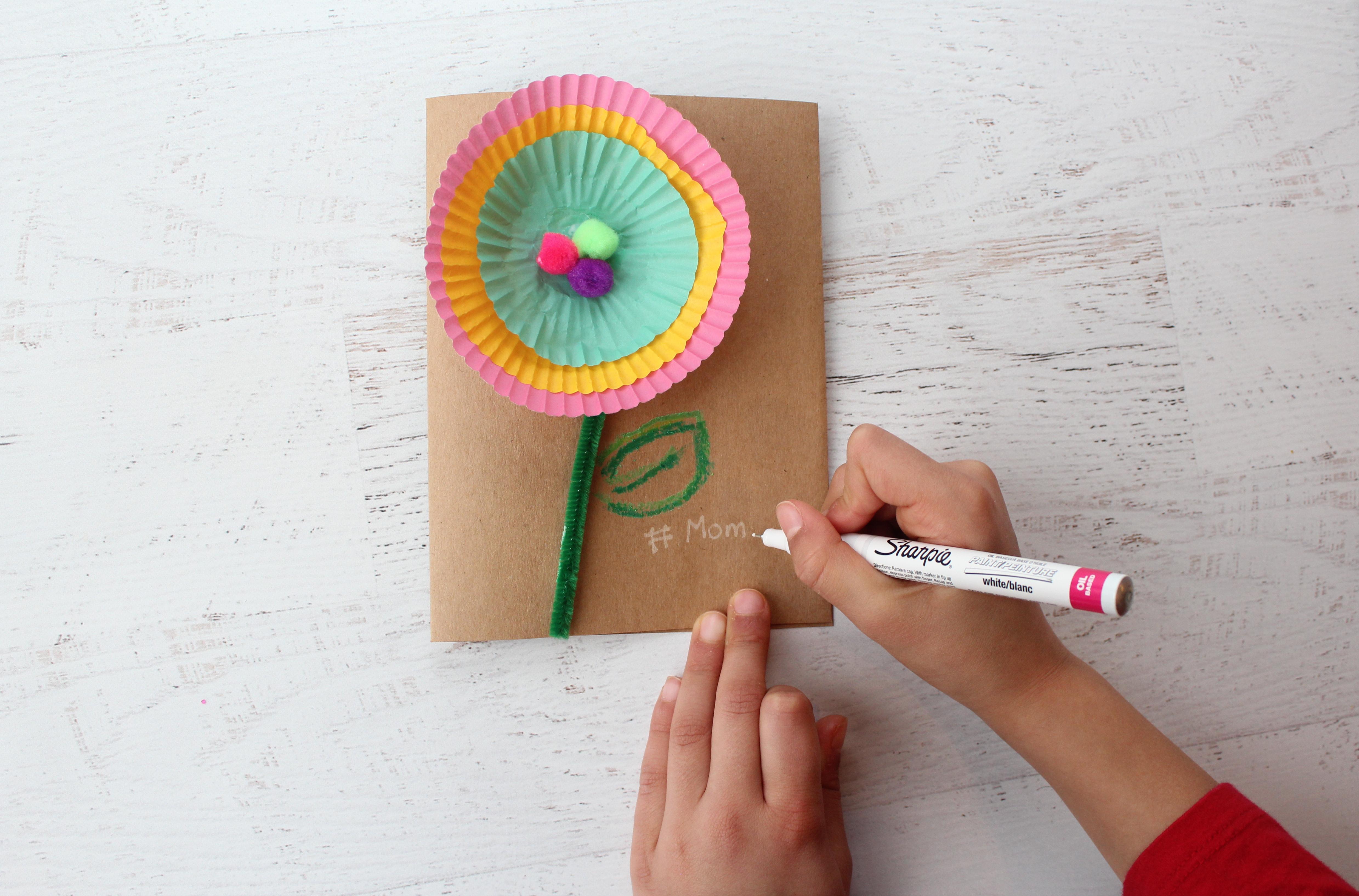 Write on a special message for your mom! We used a white Sharpie marker, but you can also use a black marker if you have that laying around. Another idea is to use letter stickers to spell “mom” or any other message.
