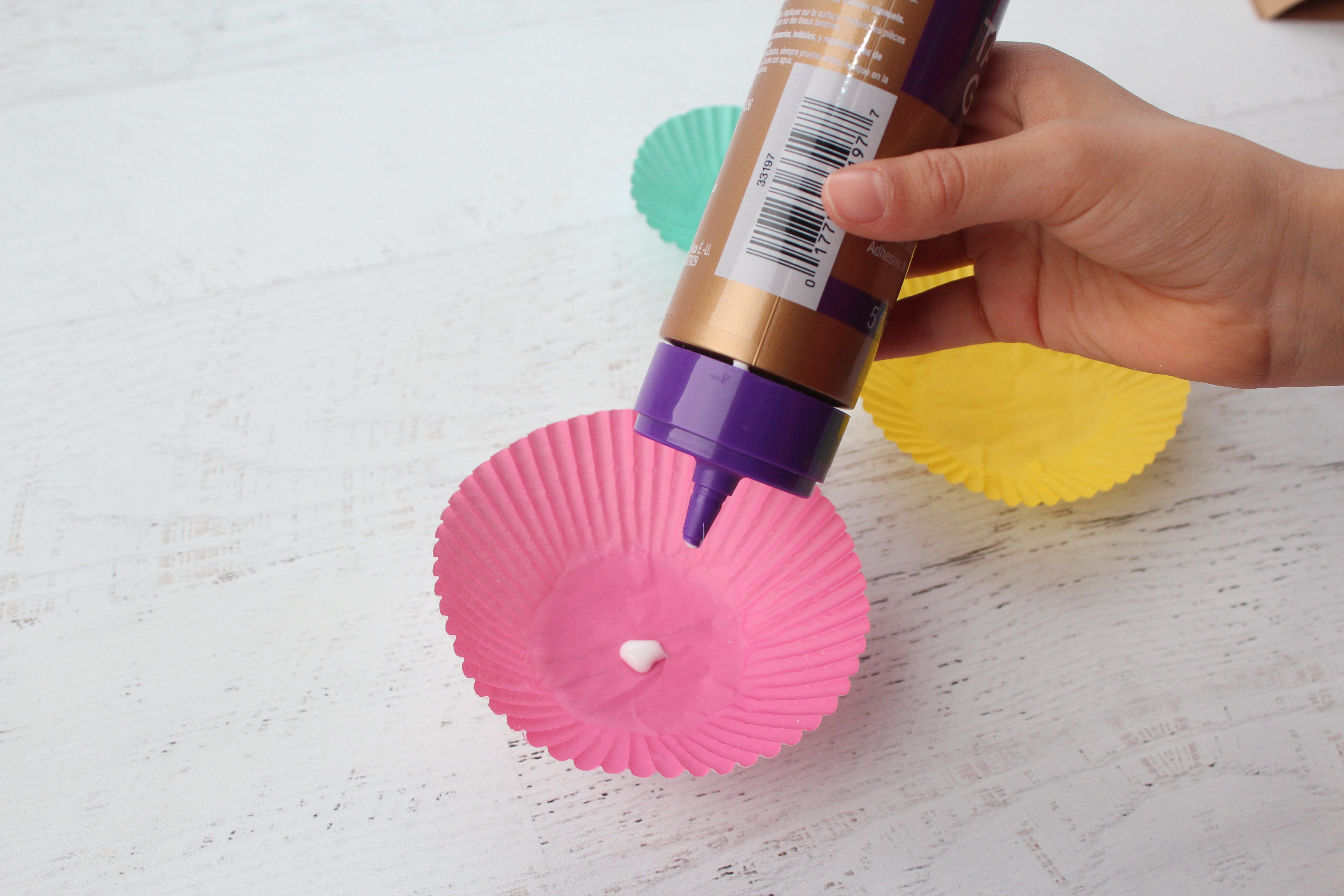 Layer 1: To make the outer (base) layer for the flower, take a standard size cupcake liner and flip it inside out, so that the pattern/colored part is on the inside. By doing this, it gives a natural flower-y shape that’s 3D or pop out.