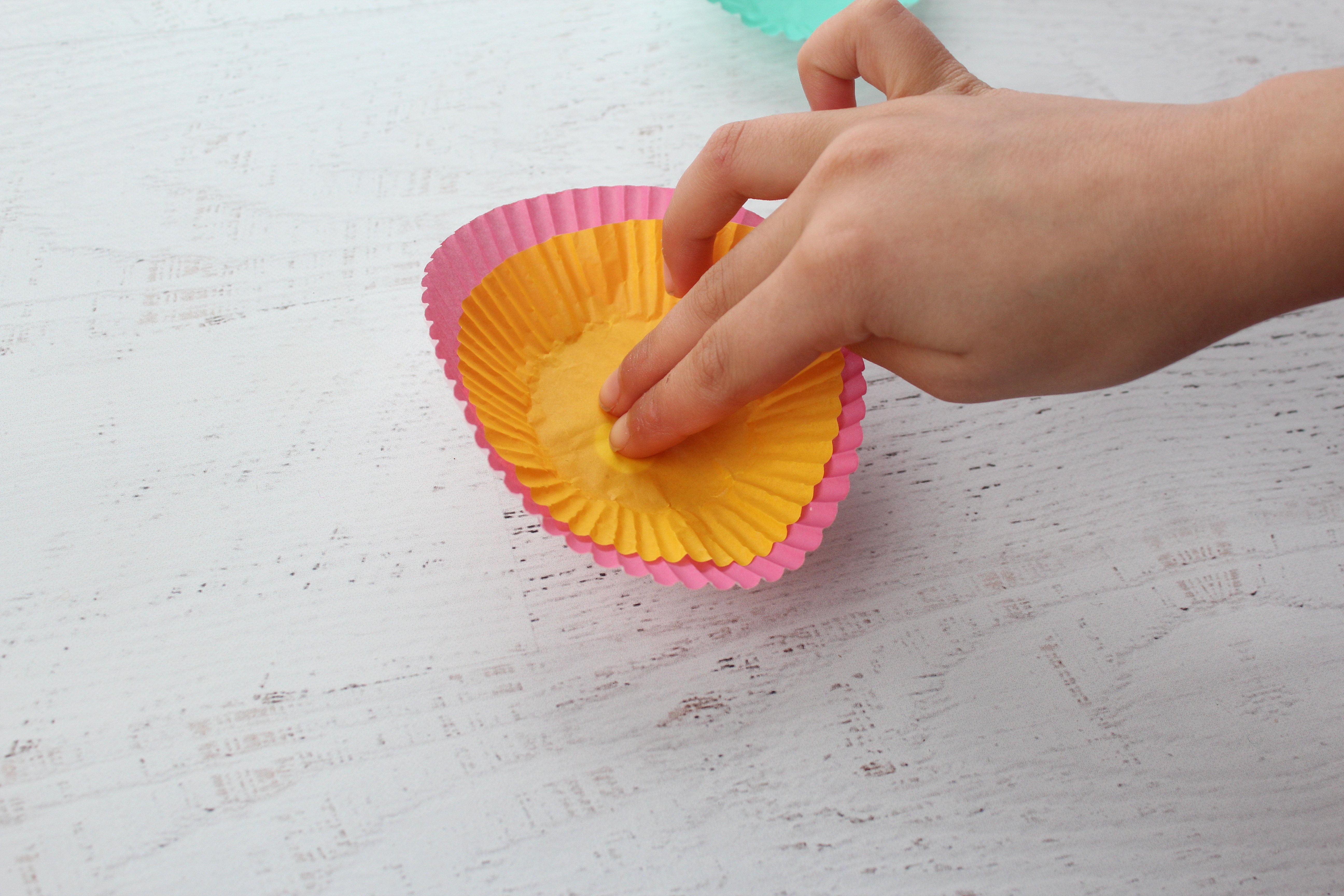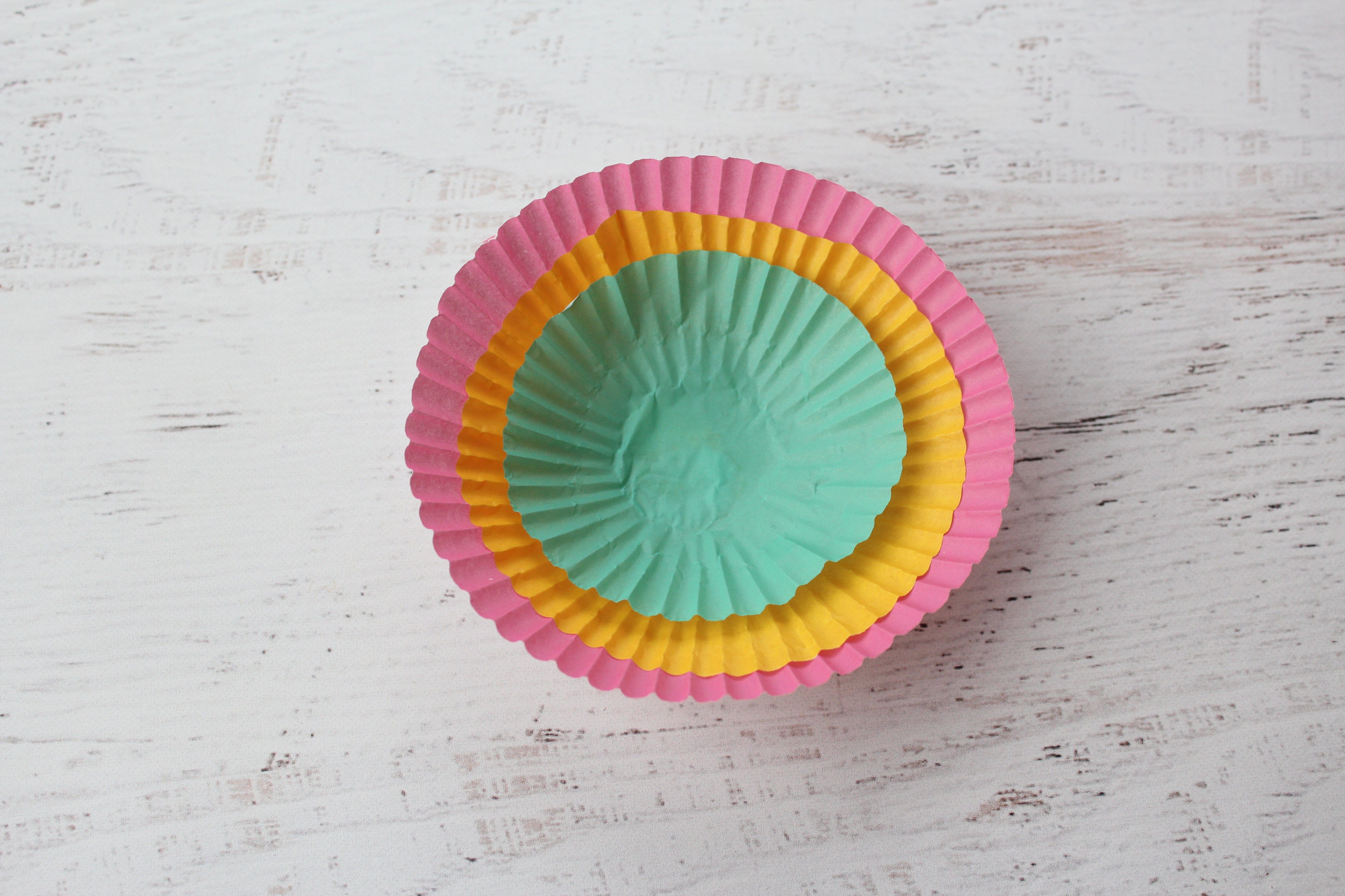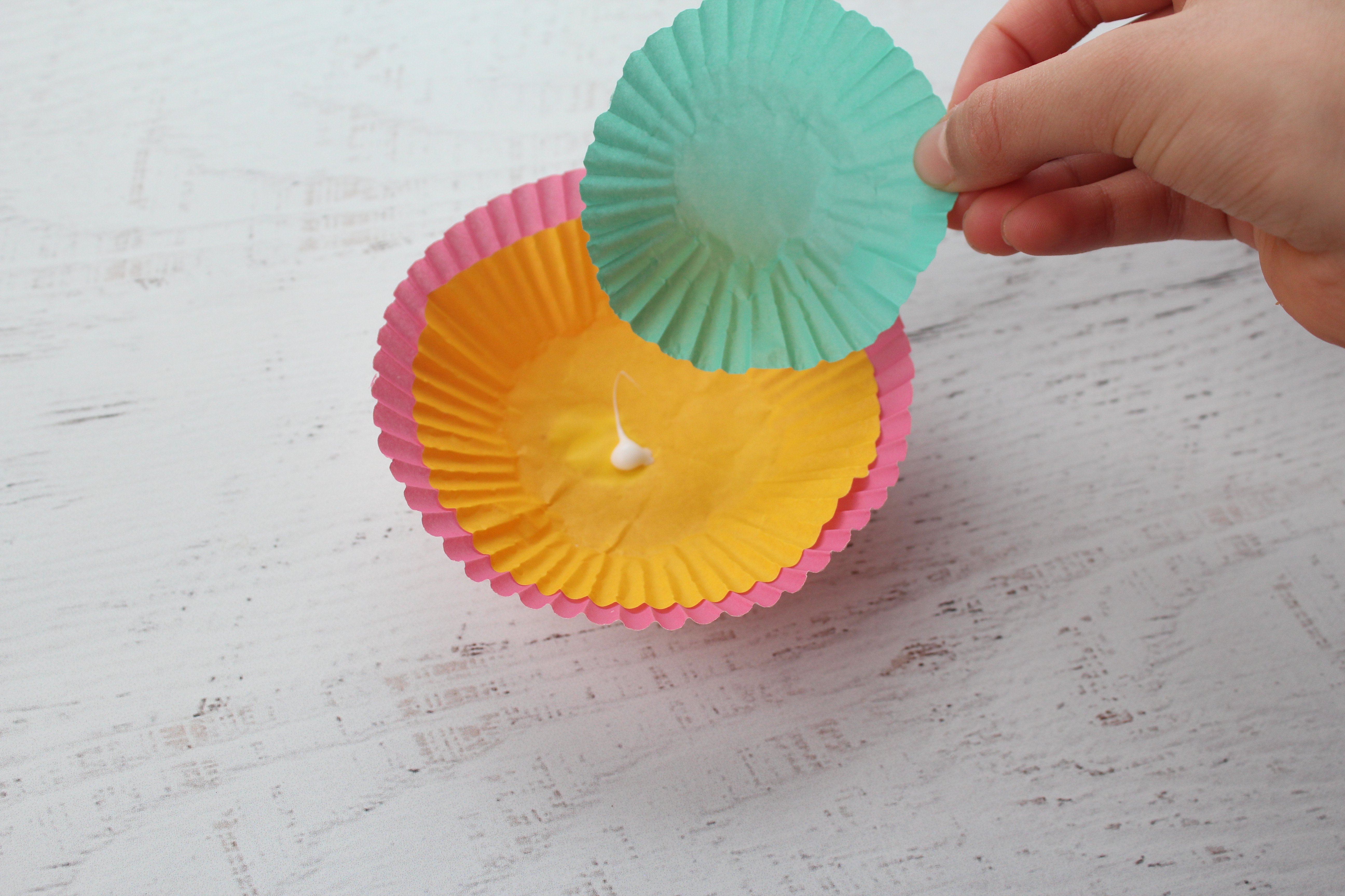 Layer 3: to make the 3rd (and final) layer, this time take a mini size cupcake liner. Turn it inside out like the previous layers. Do not cut.