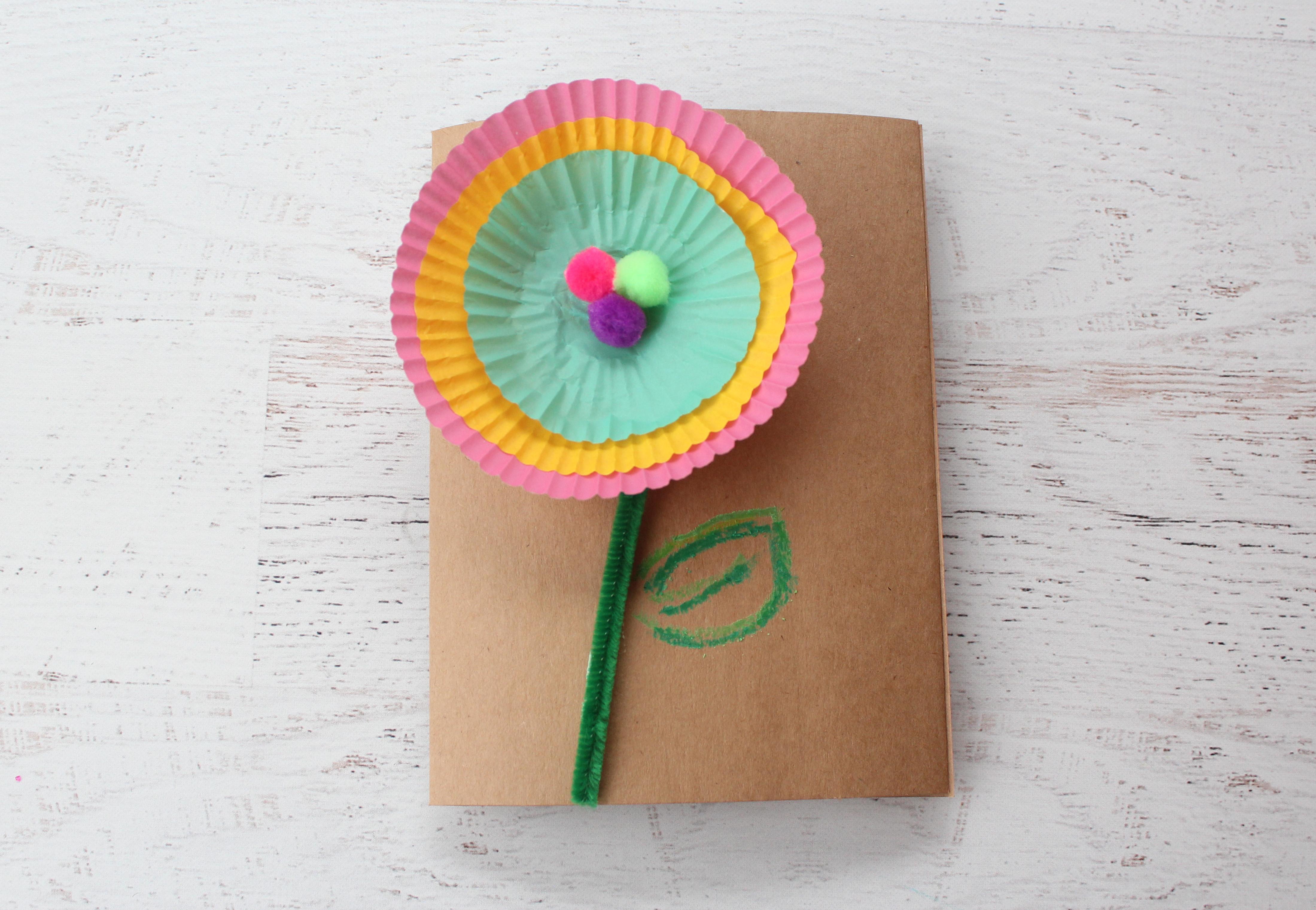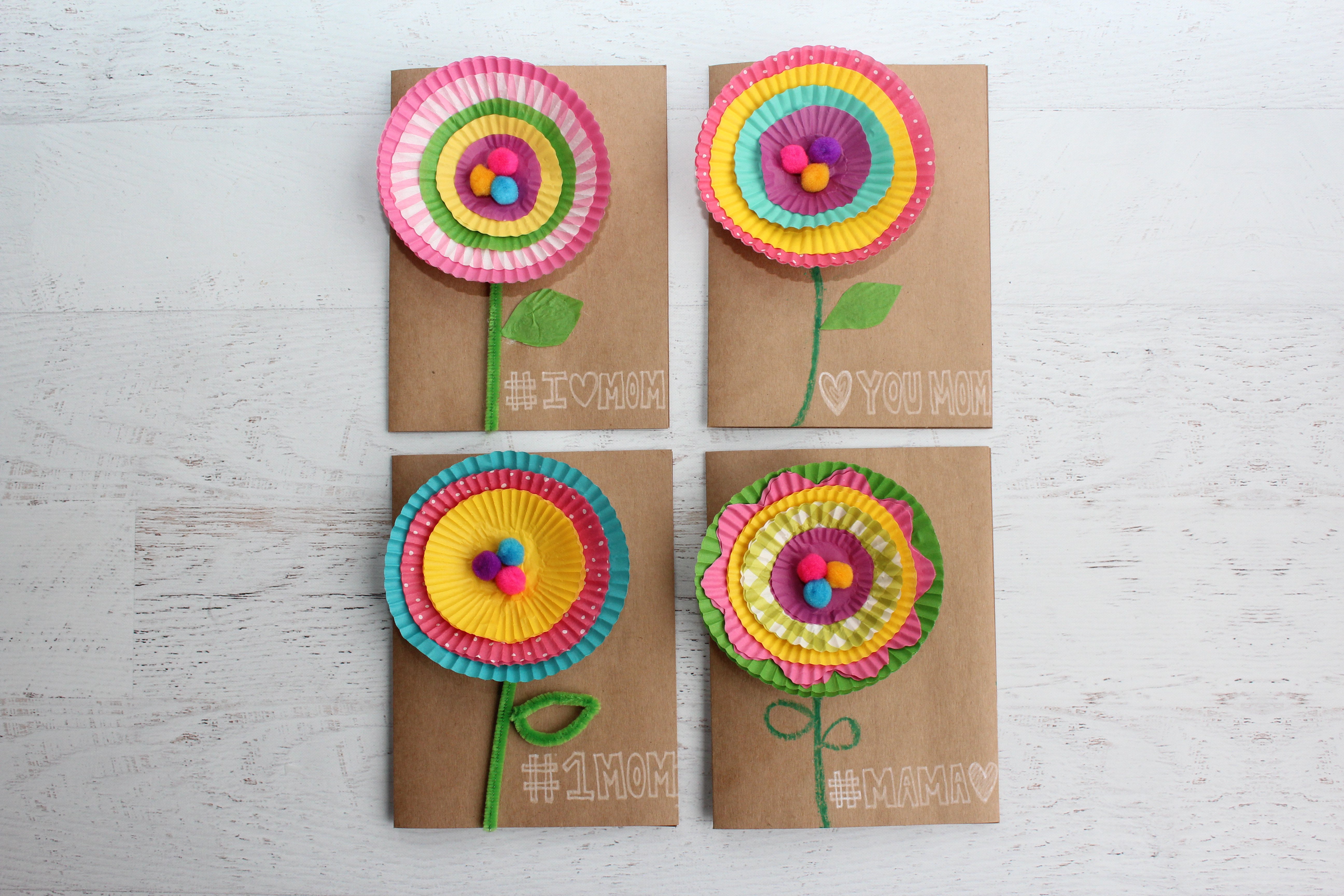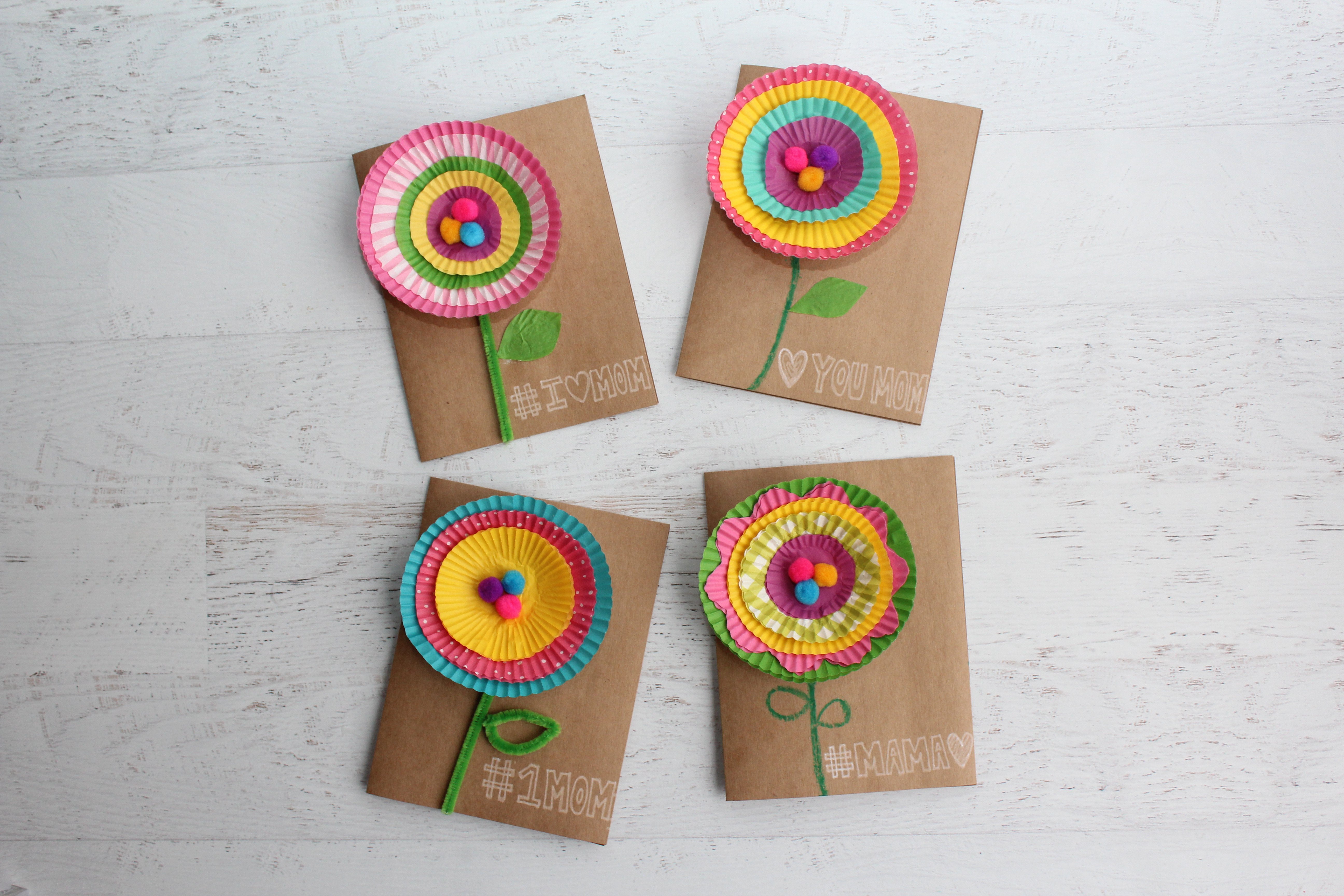 Make a super cute homemade DIY mothers day card using cupcake liners and pom poms! These also make thoughtful birthday card ideas for mom. Read below on how to make these DIY flower cards, with a simple step by step guide.