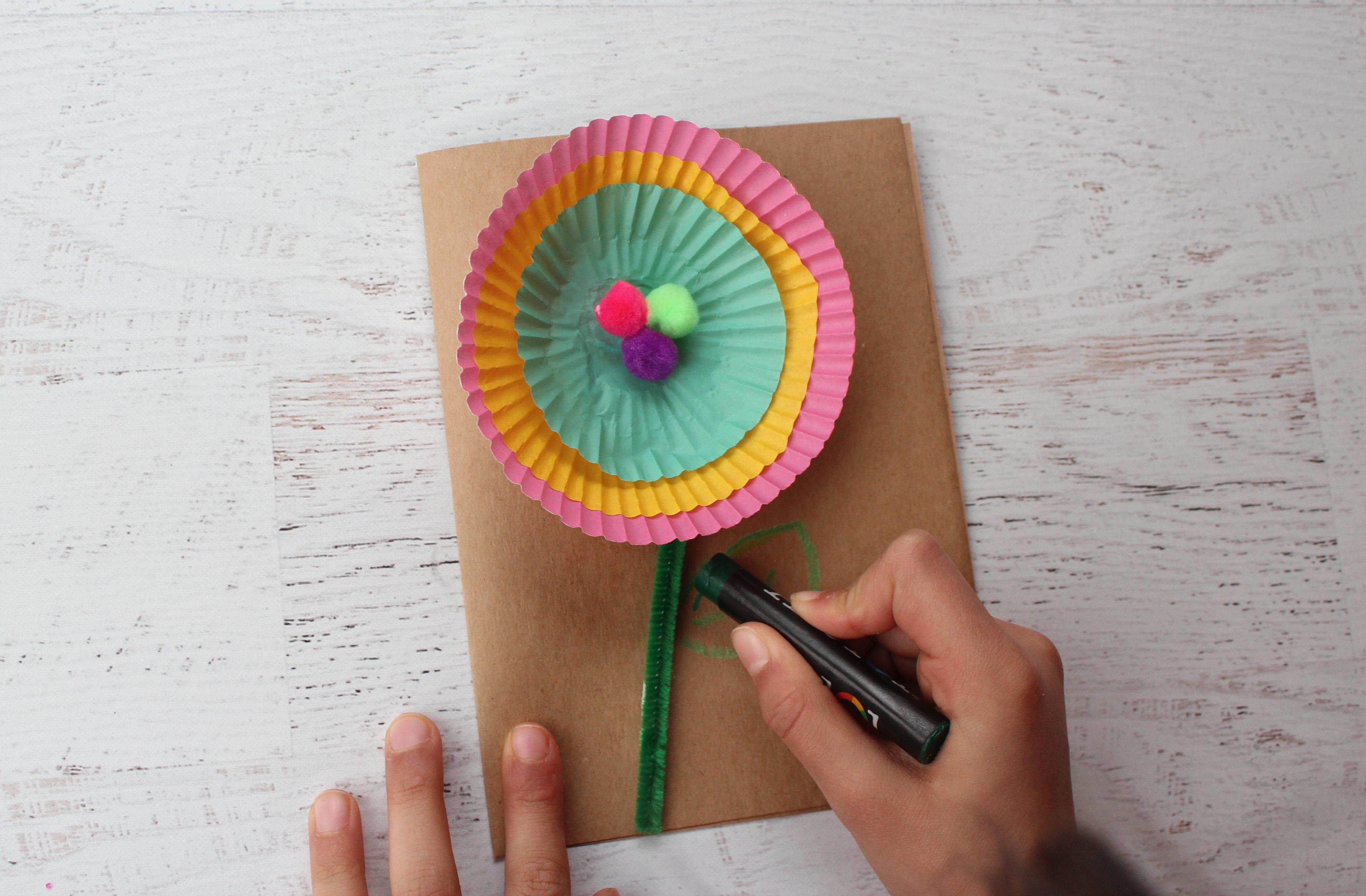 - For more texture and 3D look, glue on a green pipe cleaner as the stem and draw on the leaf with a green crayon