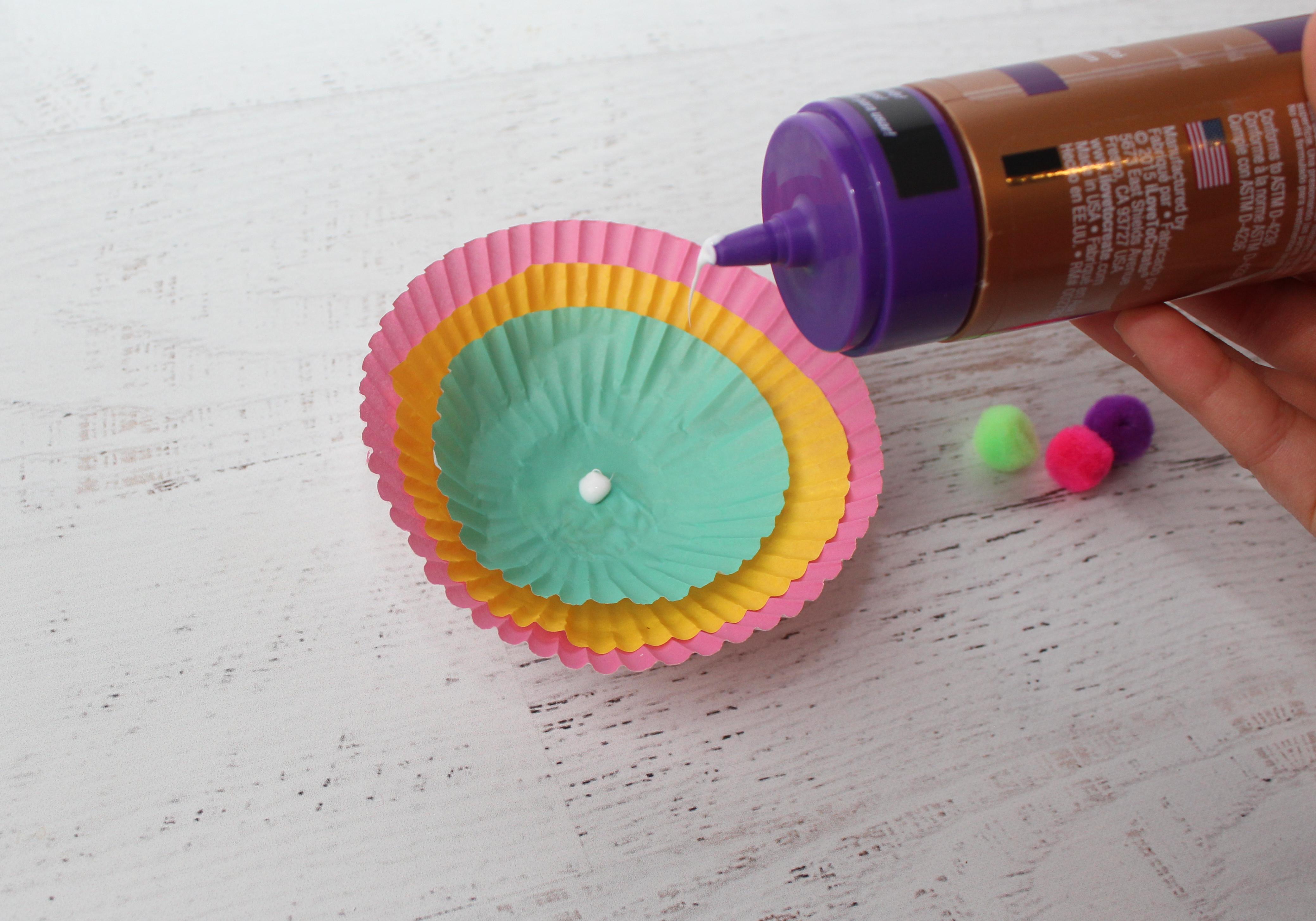 Take some small sized pom poms and glue them to the center of the flower. Some other idea’s if you don’t have pom poms on hand (buttons, glitter glue, foam stickers etc..)