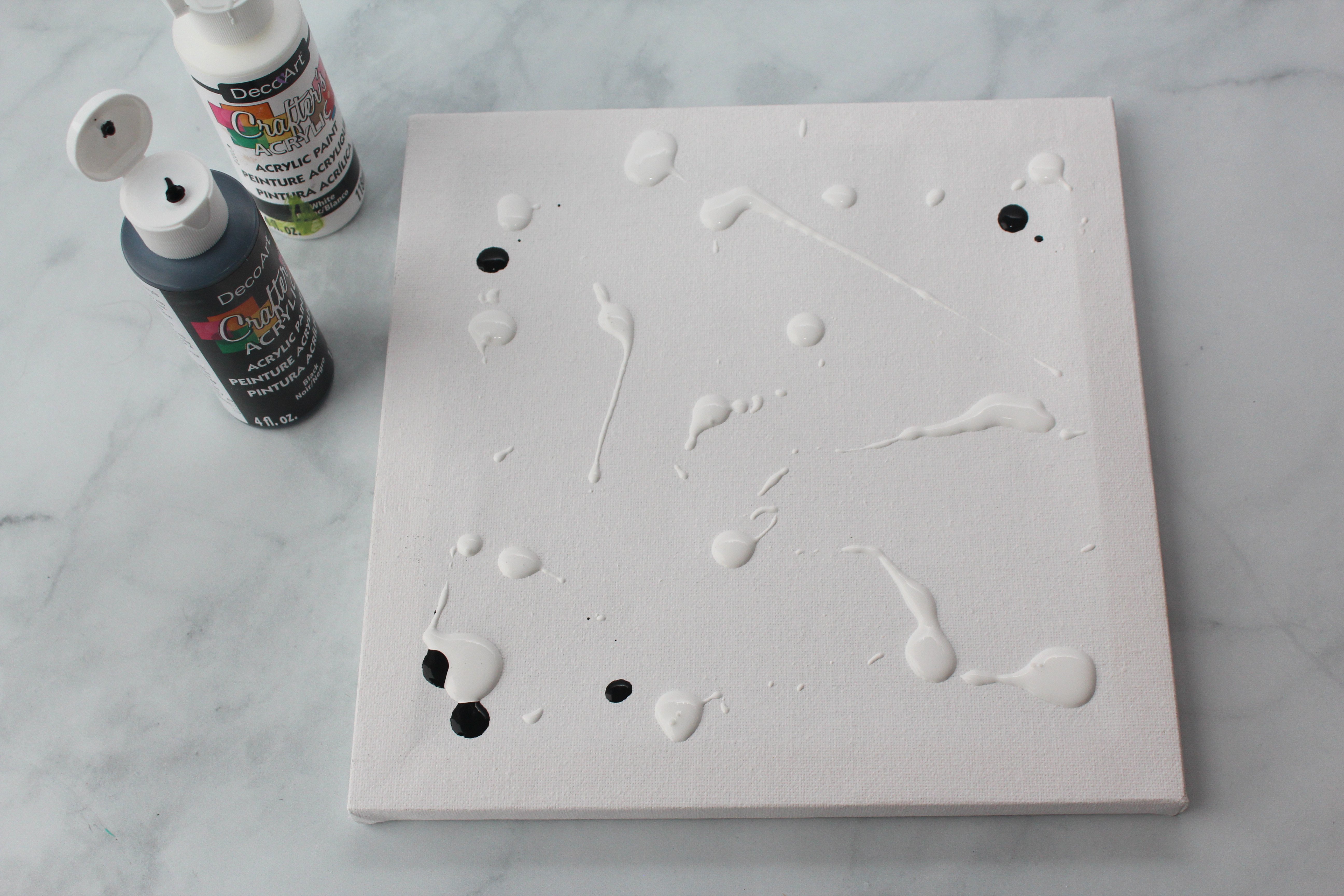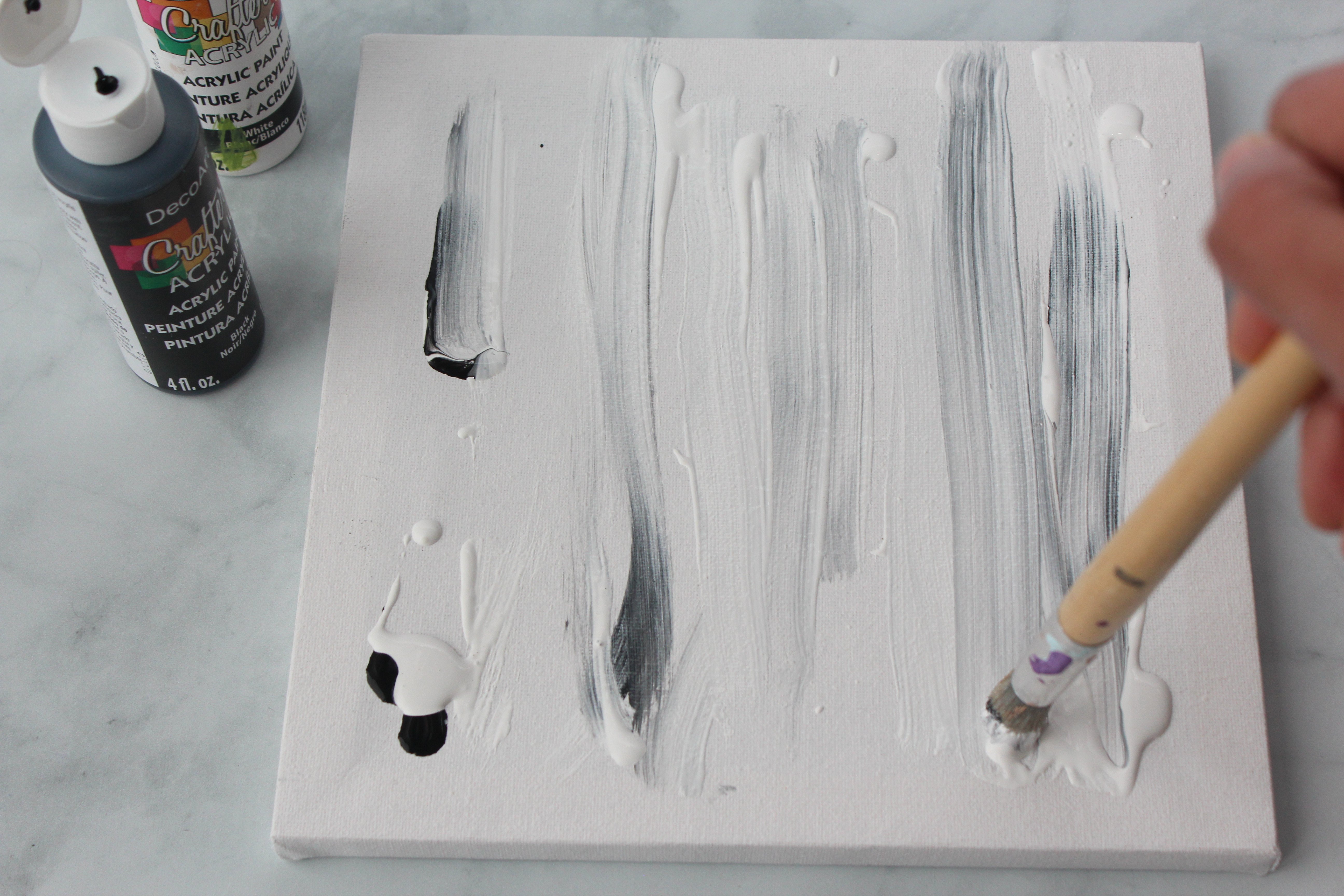 Add a few drops of white acrylic paints straight onto your canvas, along with 3-4 drops of black paint (focusing on the outer edges). Black is a very strong pigment, so a tiny bit goes a long way.