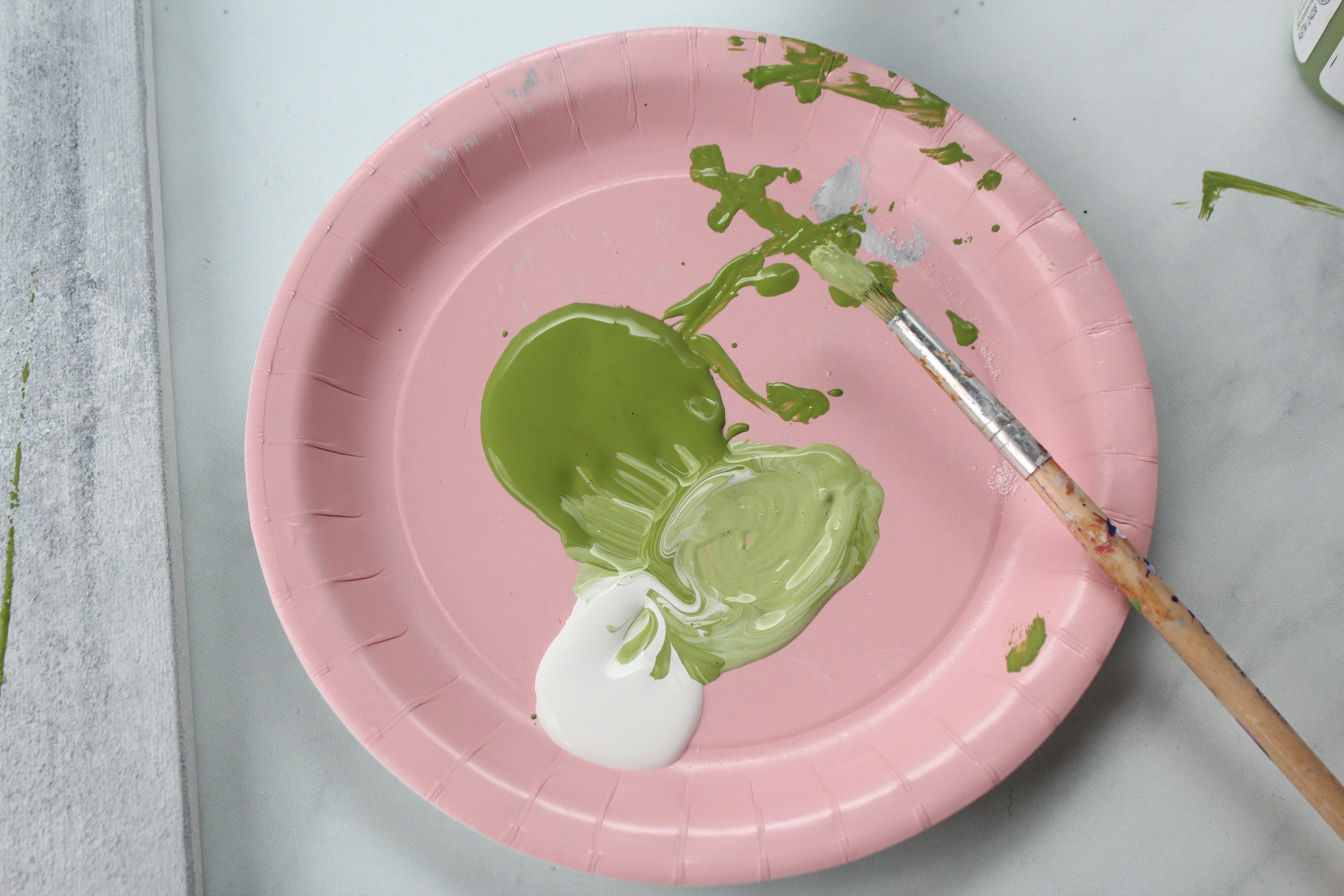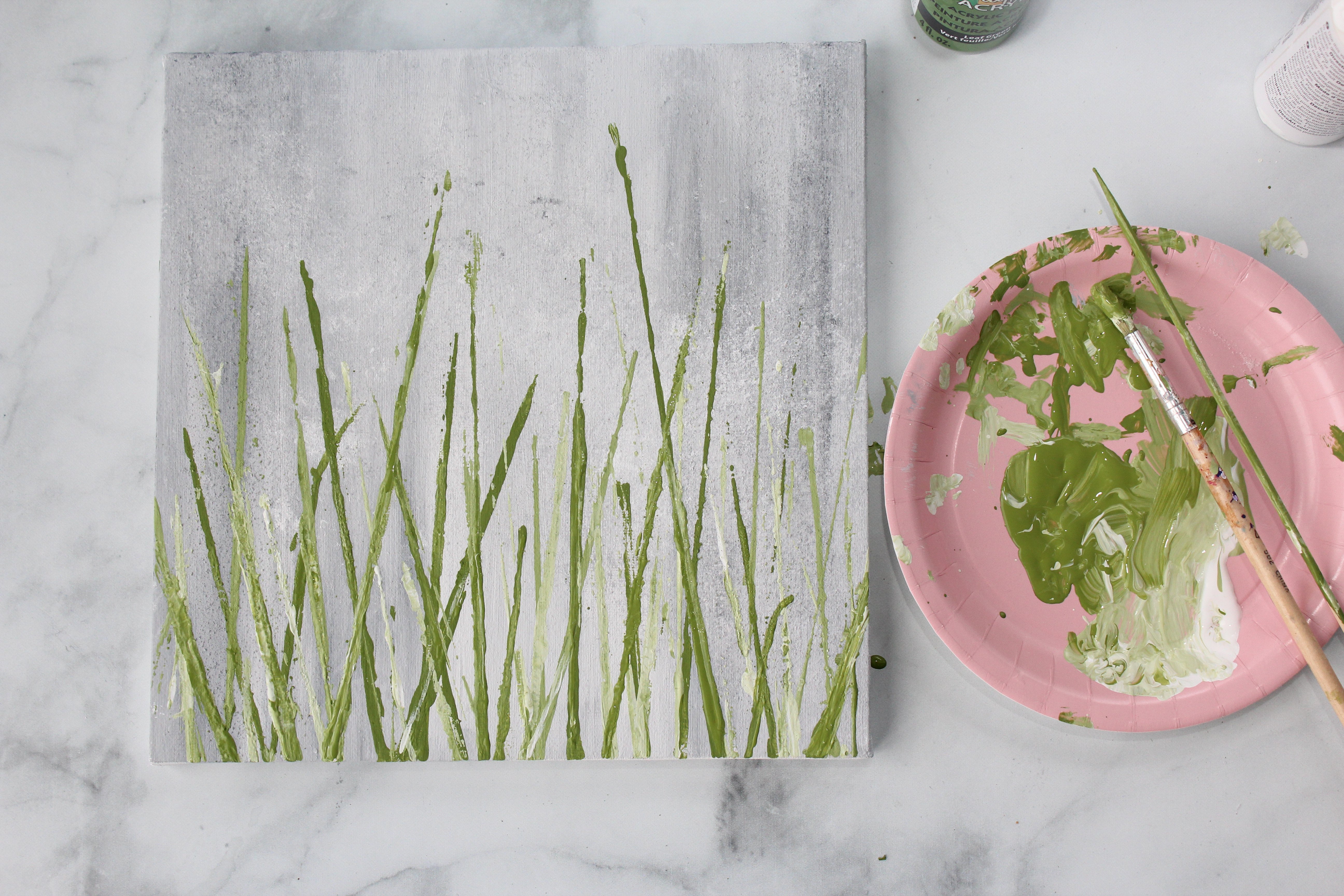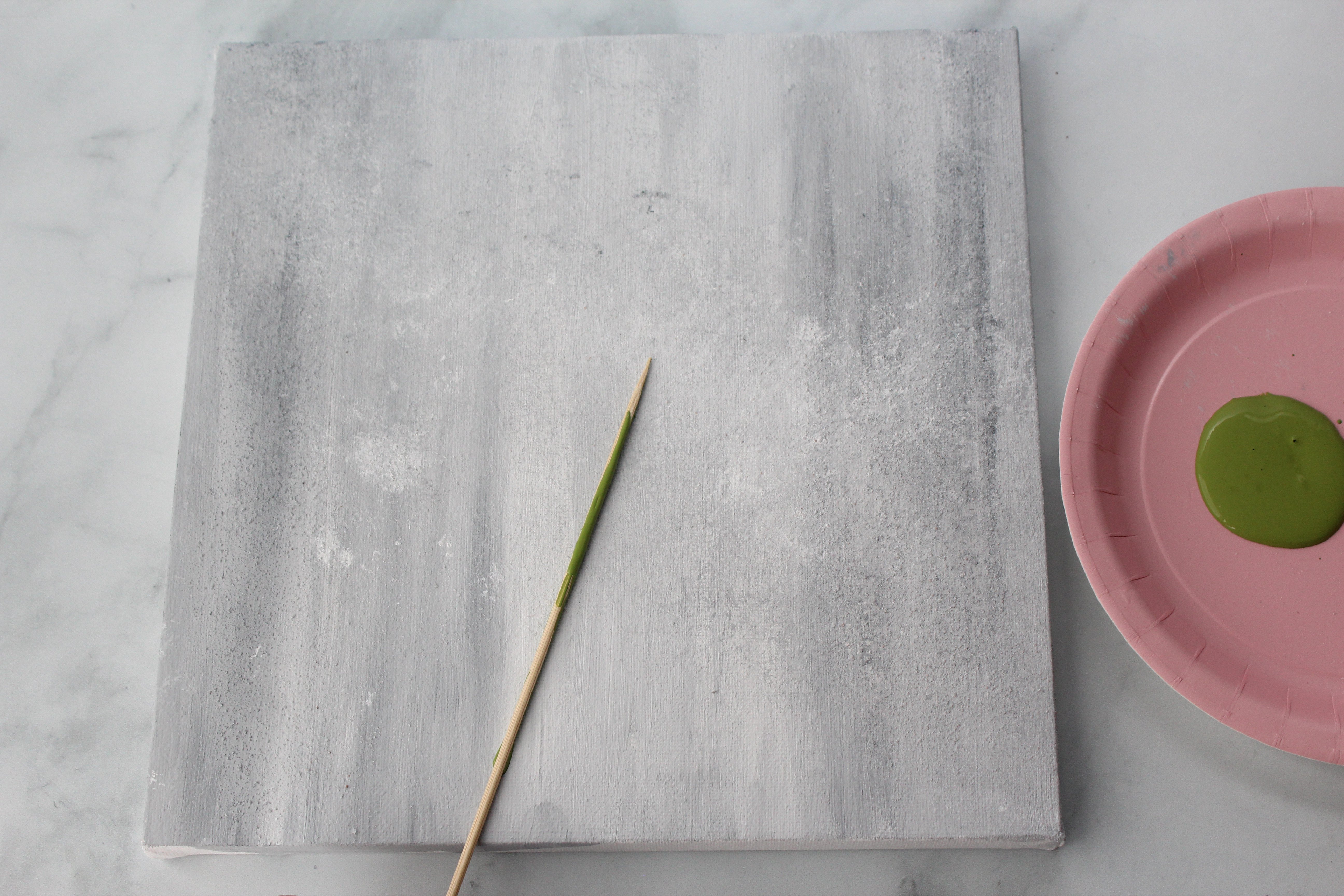 Once the background is dry its time for some flowers! First off we’ll do the stems. Add some green paint into your pallet or a paper plate.