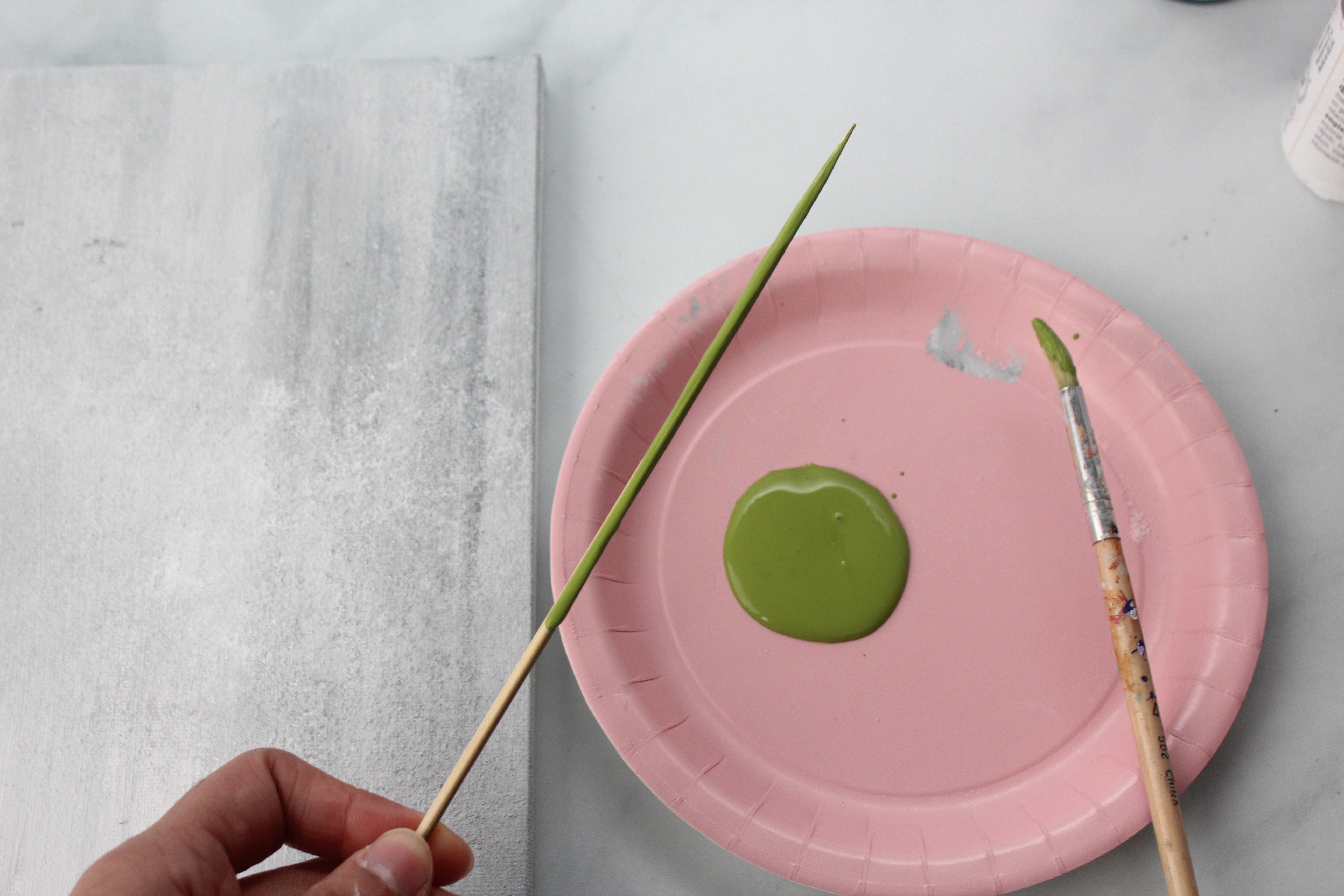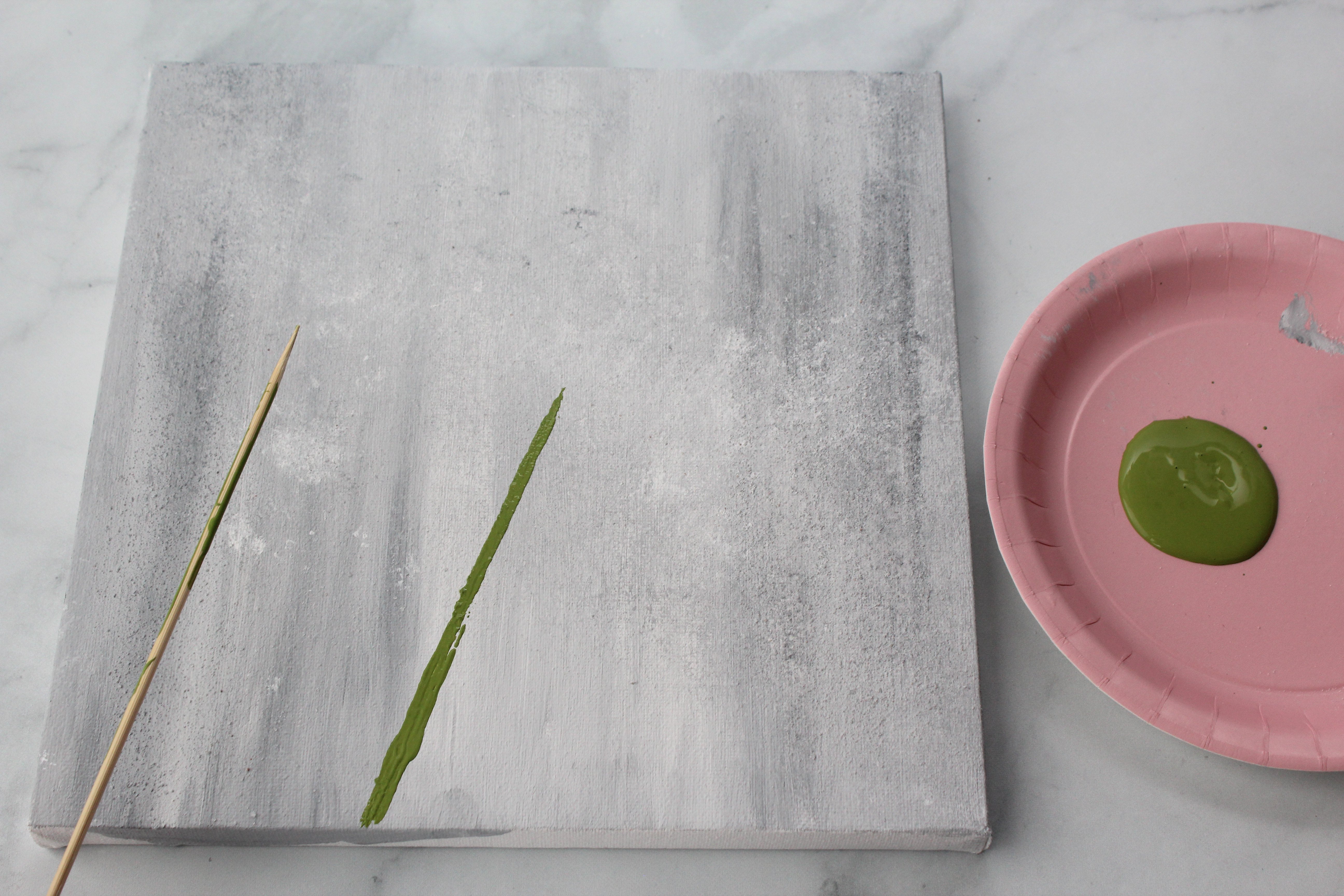 Using a clean brush, paint some green onto your wooden skewers. (Alternatively you could use the handle of a long paintbrush, instead of the skewer). Press the skewer (paint side down) onto the canvas. Life up the skewer to see your green stem. Nifty!
