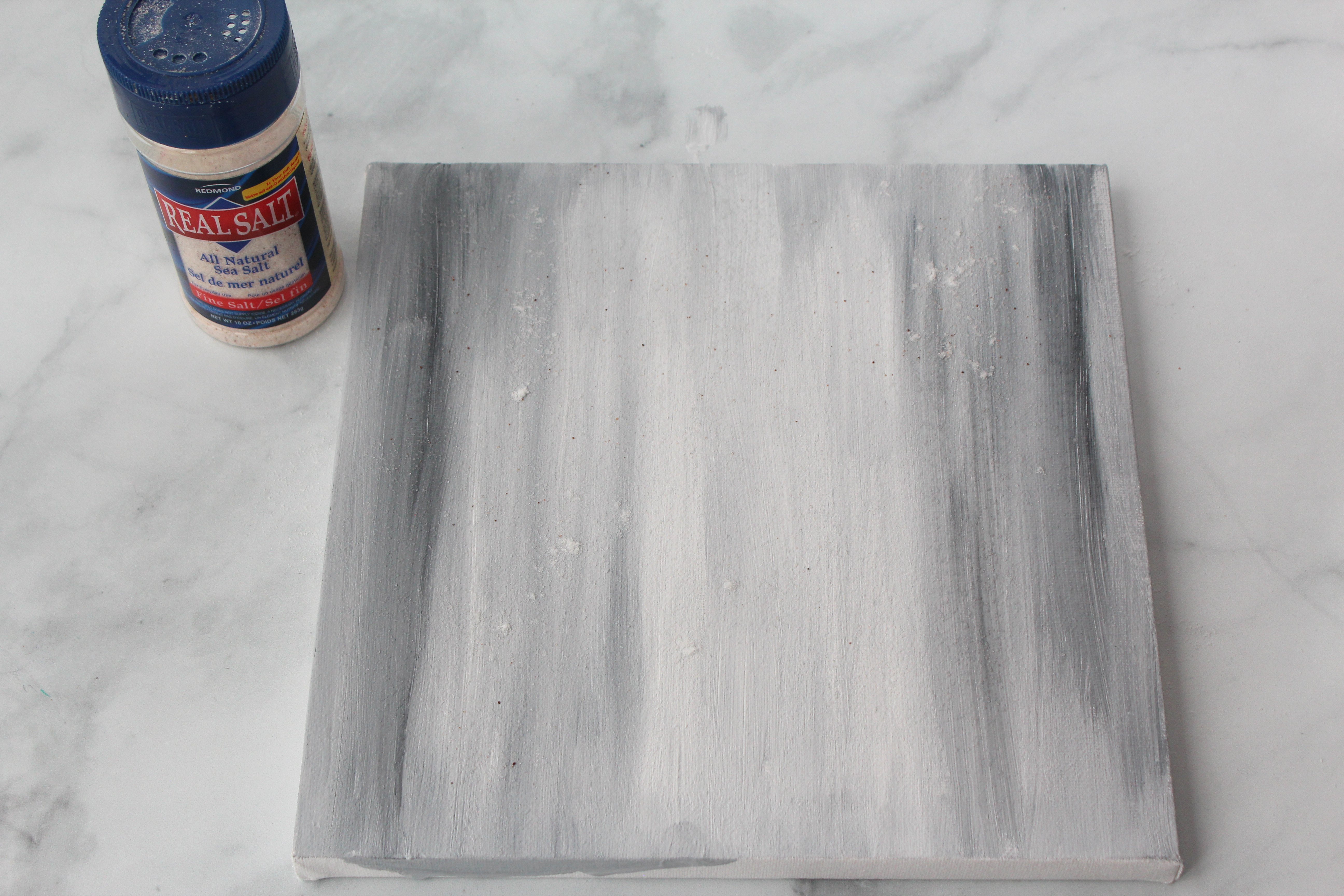 To add a bit of texture to the top portion of the painting (the bottom portion will be covered with flowers), sprinkle some salt (the chunkier the grains of salt the better) into the wet paint. Once the paint dries the salt will add a nifty “bumpy” texture look to it.