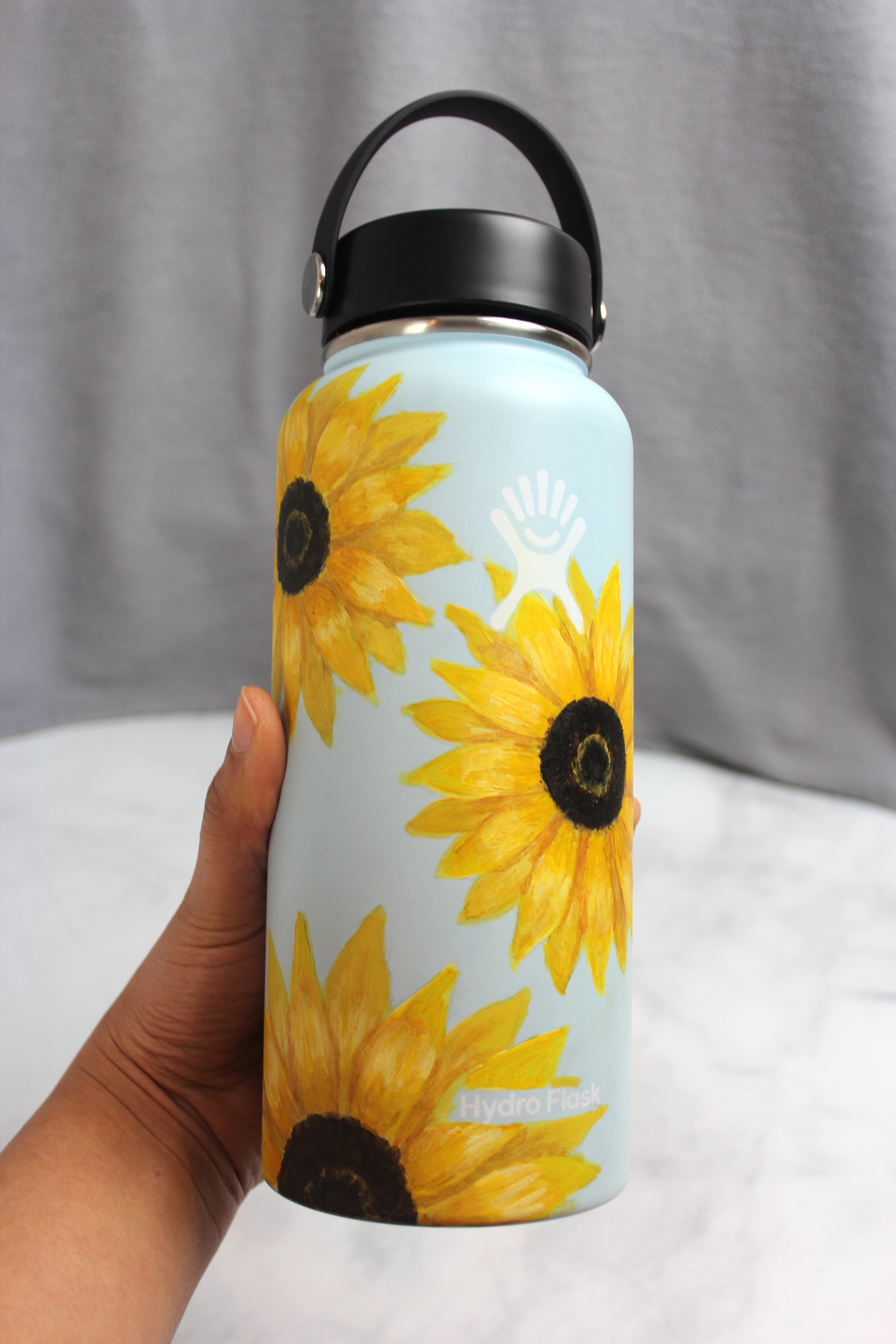 First, trace the design onto your Hydroflask with a pencil, then follow my how to paint a Sunflower tutorial to paint 3 big bright sunflowers onto your Hydroflask.