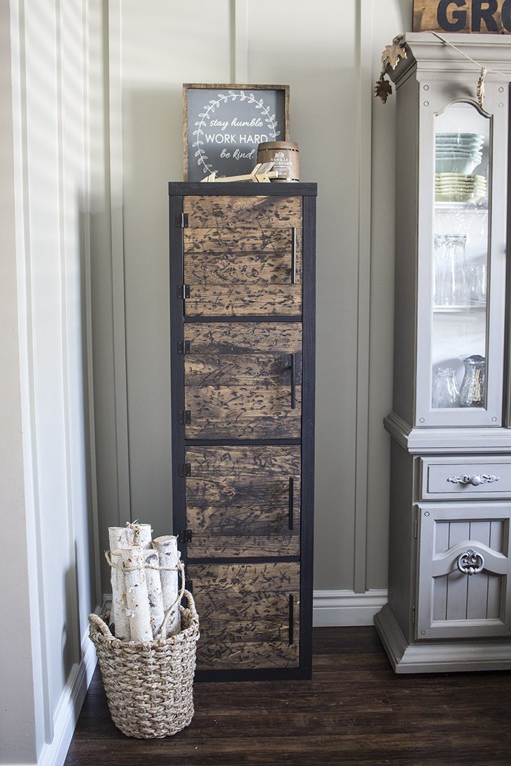 This gorgeous rustic – farmhouse styled- Kallax hack will add a decorative flare to your decor, while adding some extra storage to boot. Love the stained wood on this piece!