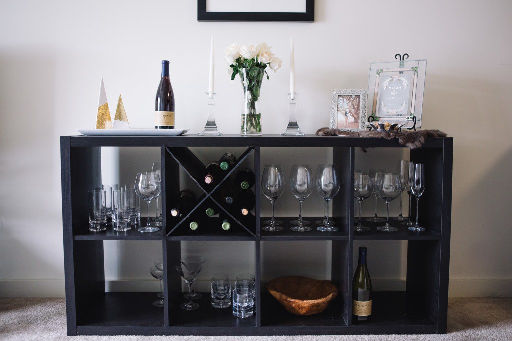 Store all your drink ingredients and glasses in a nifty bar station. A fun way to store your party drink essentials in one place!