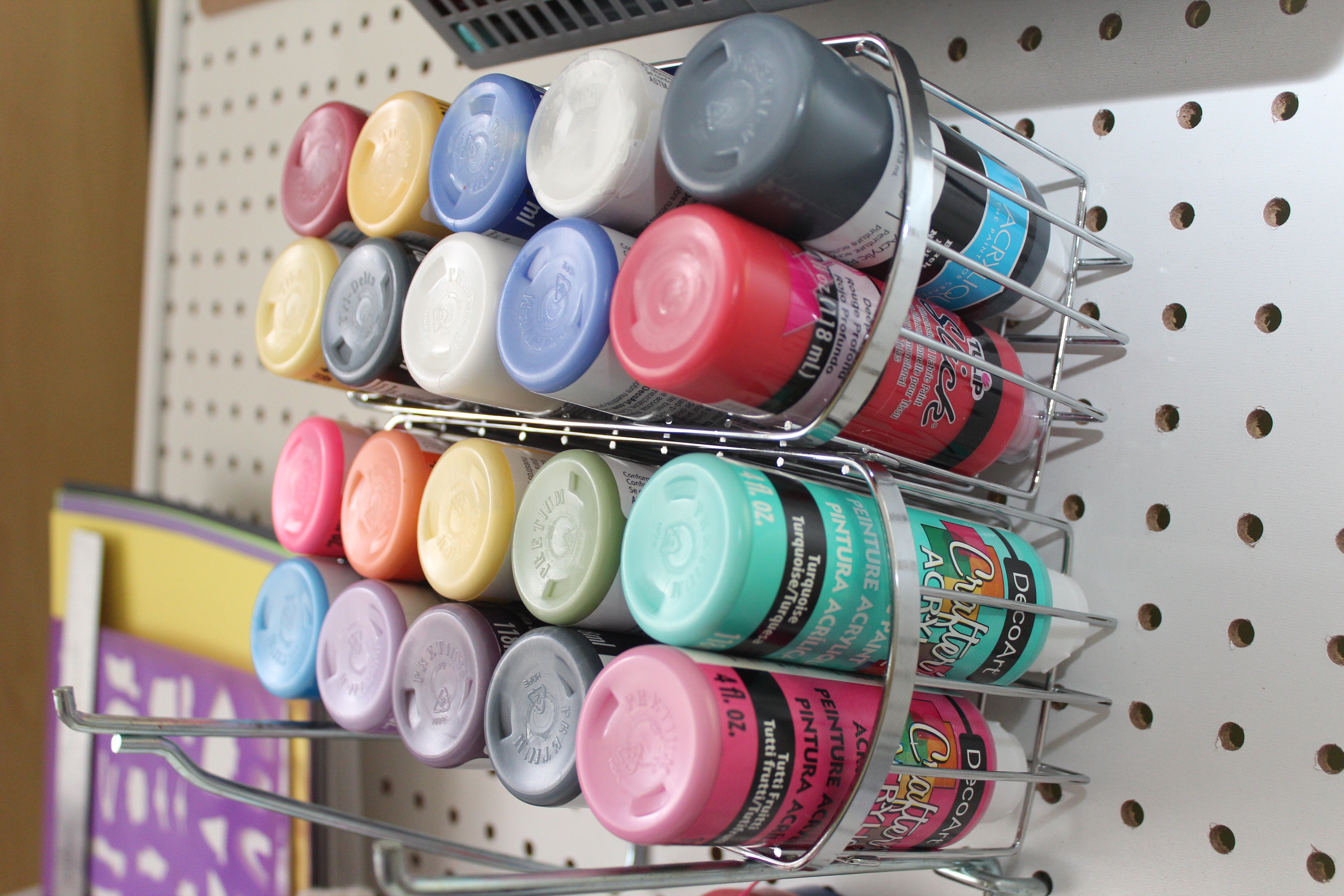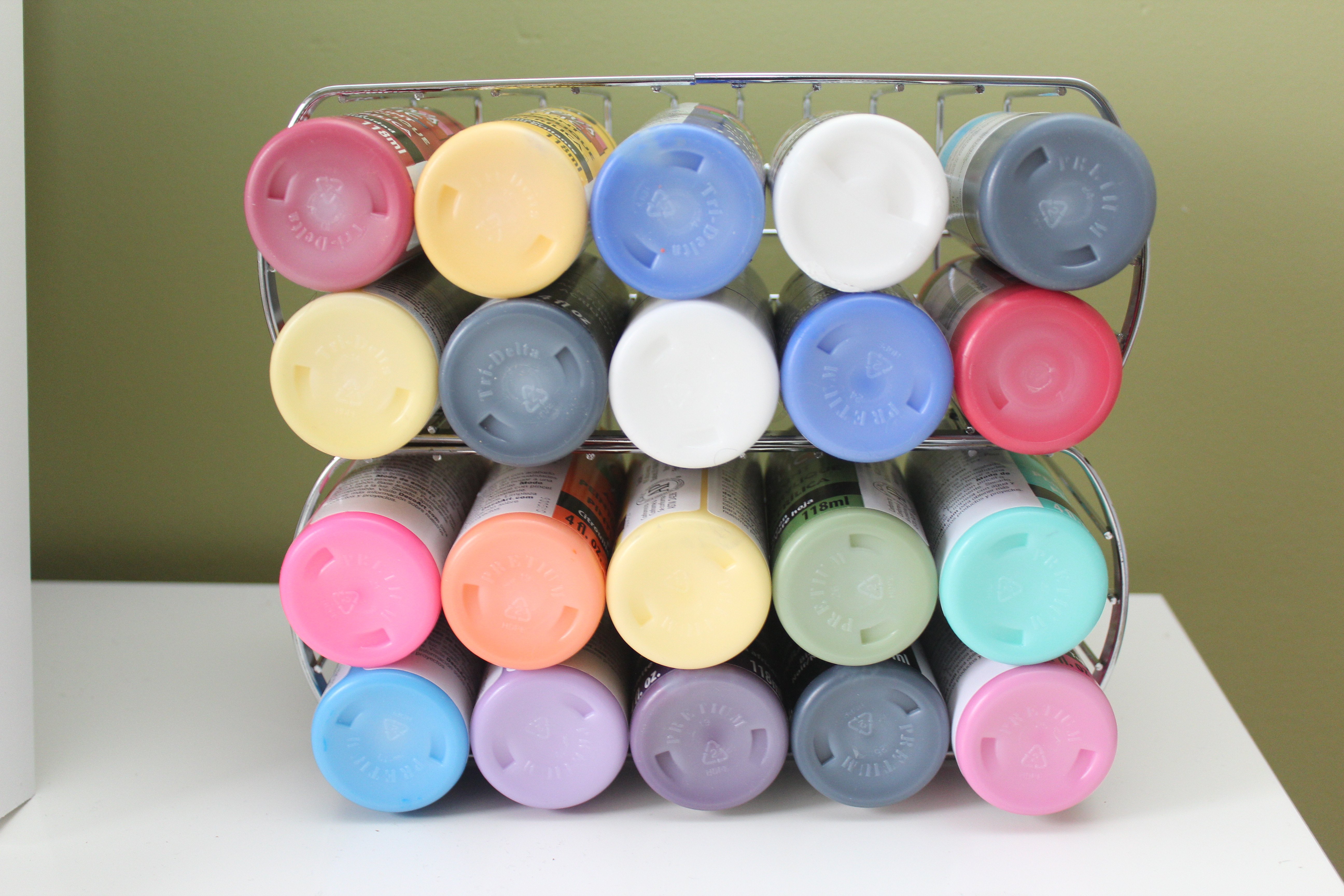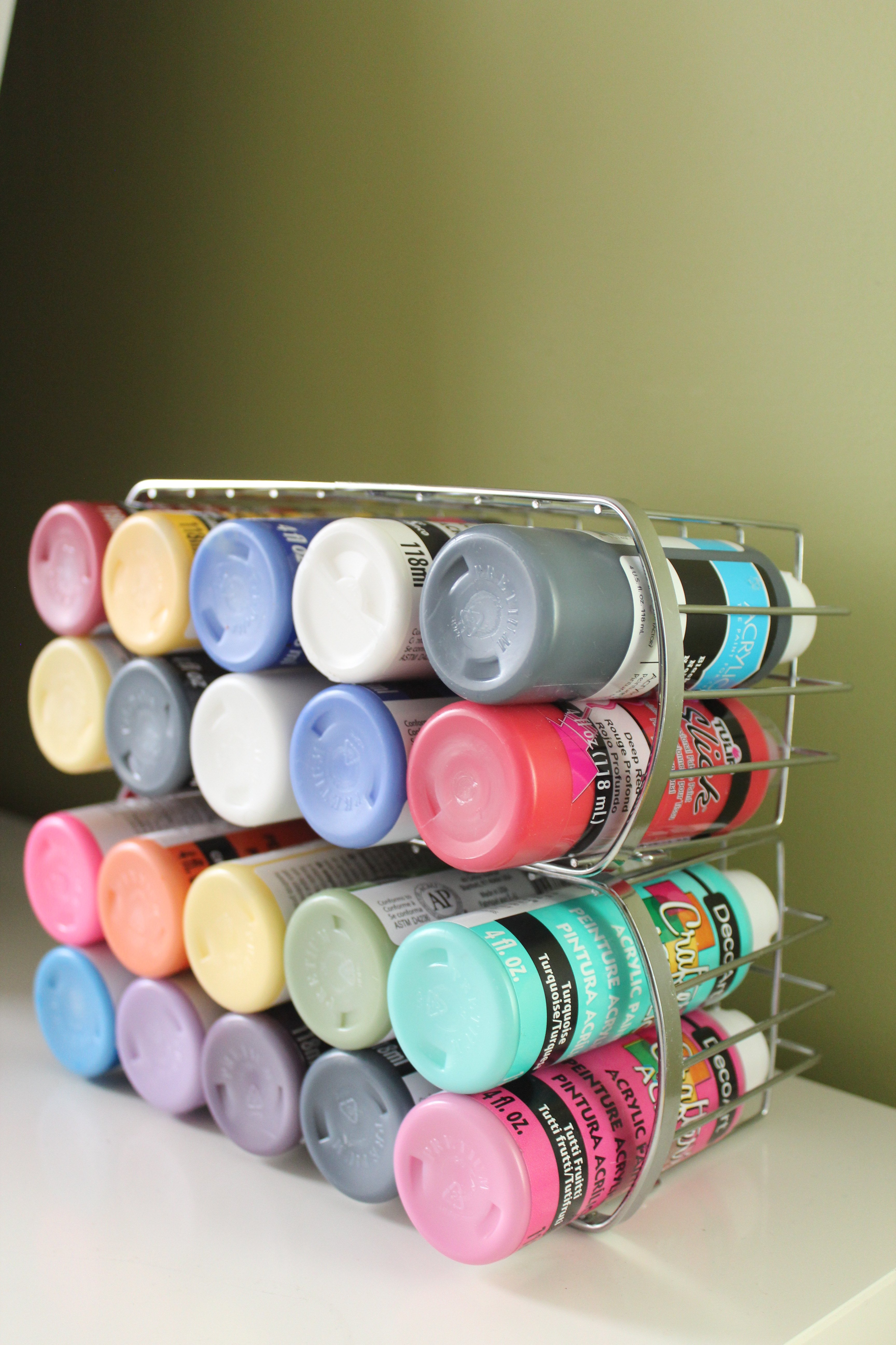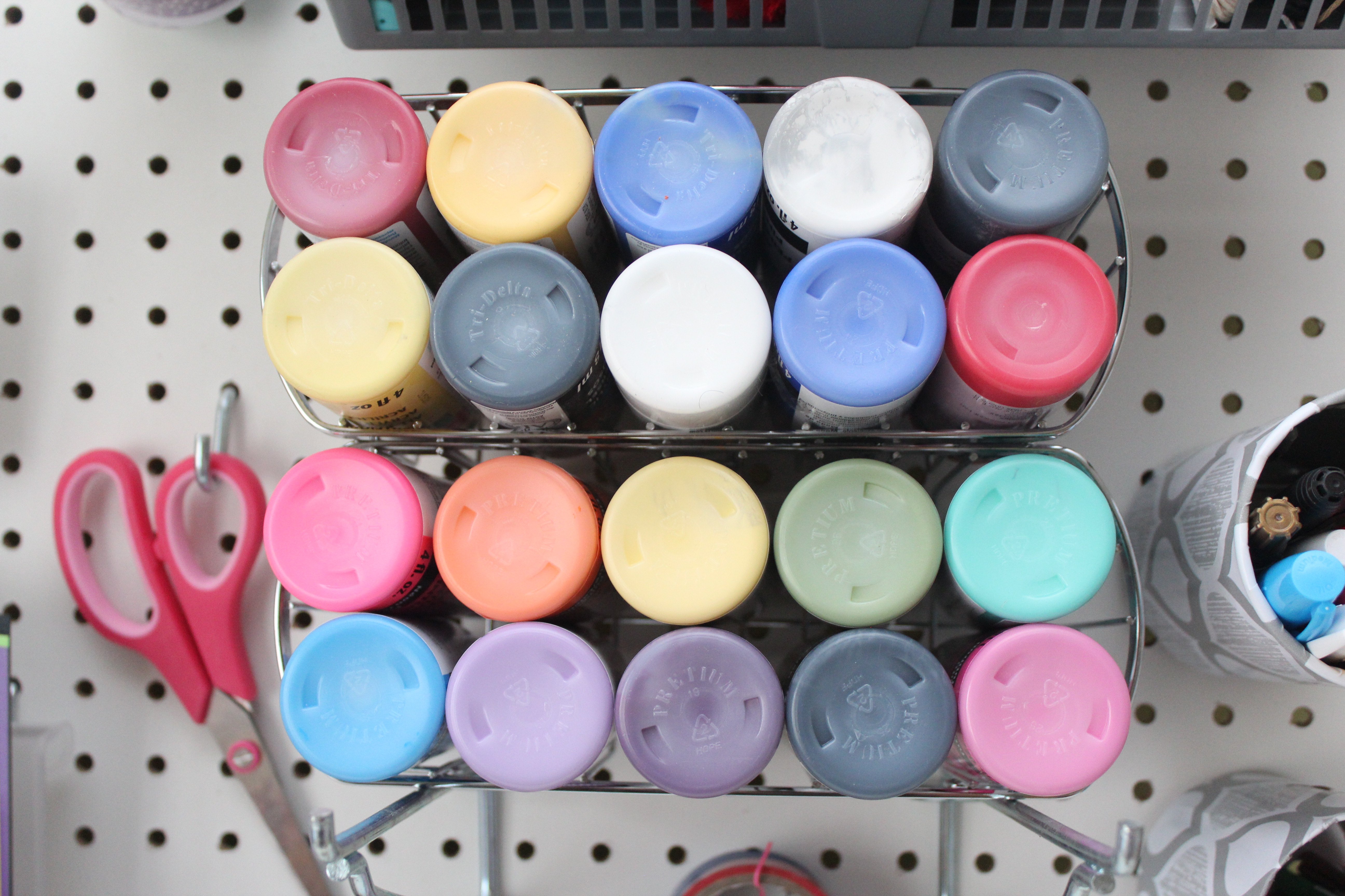 If you don’t want to mount the paint storage baskets onto the pegboard, this paint storage hack also works on any desktop too. Here are some pics of that (to give you an idea).