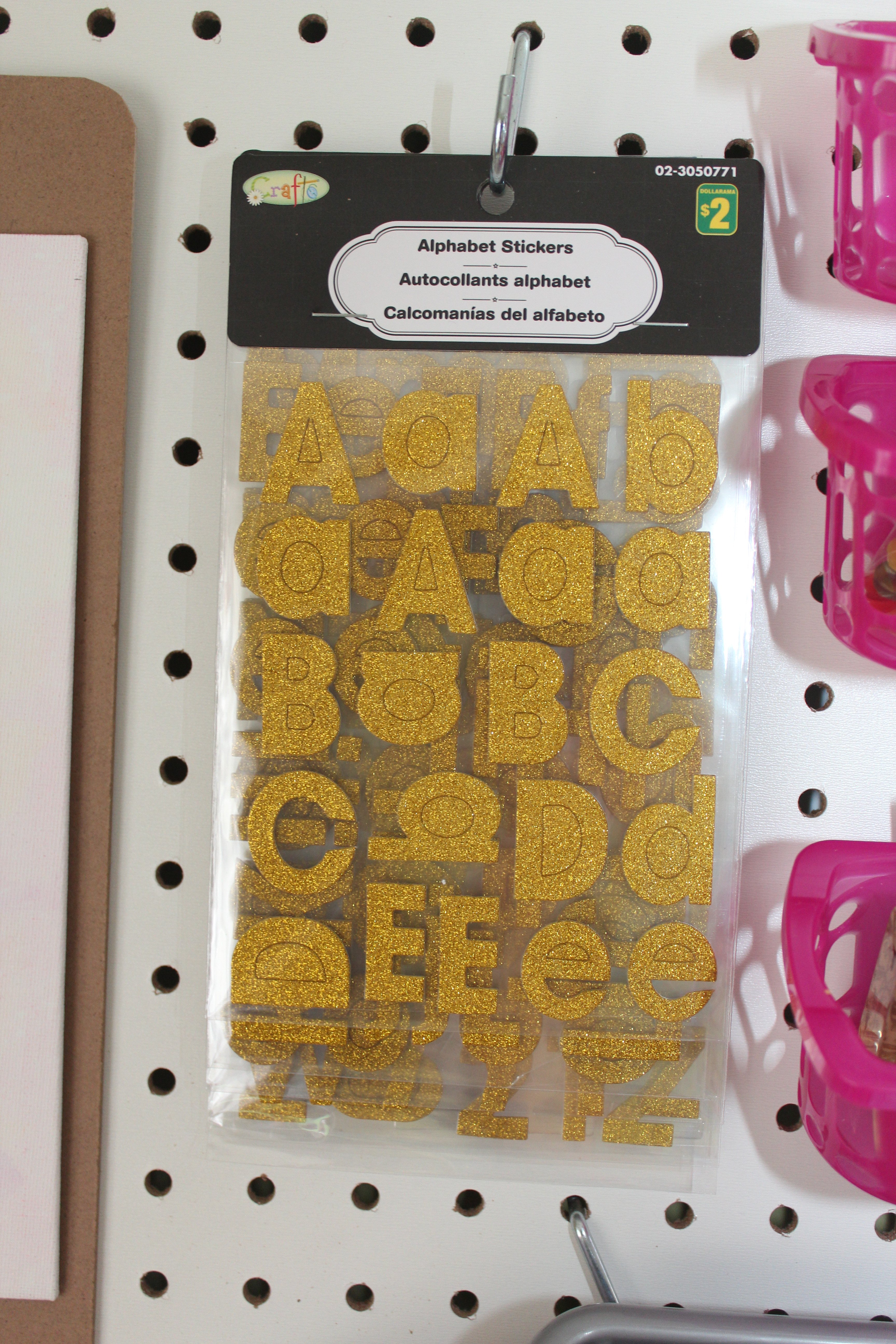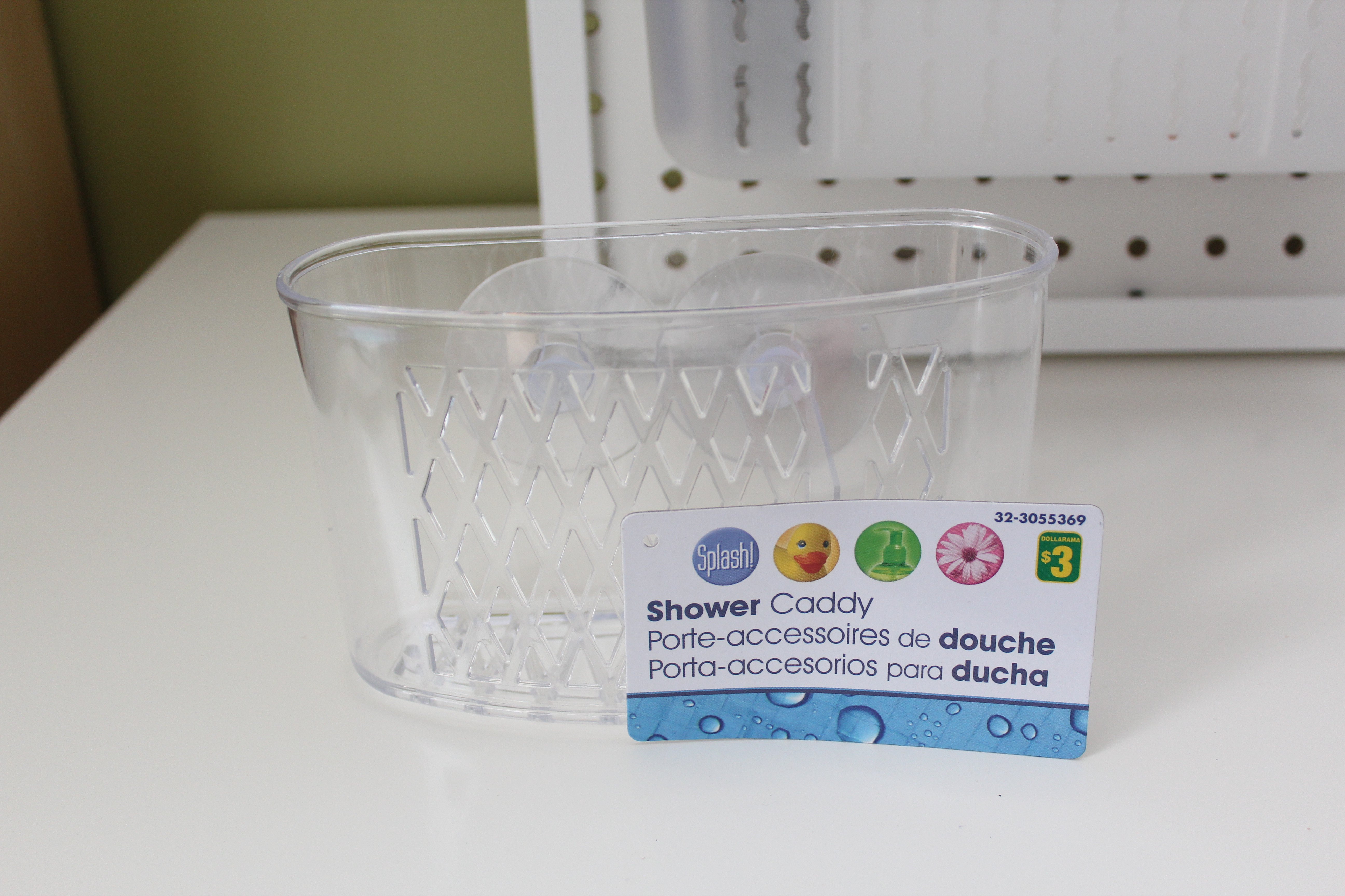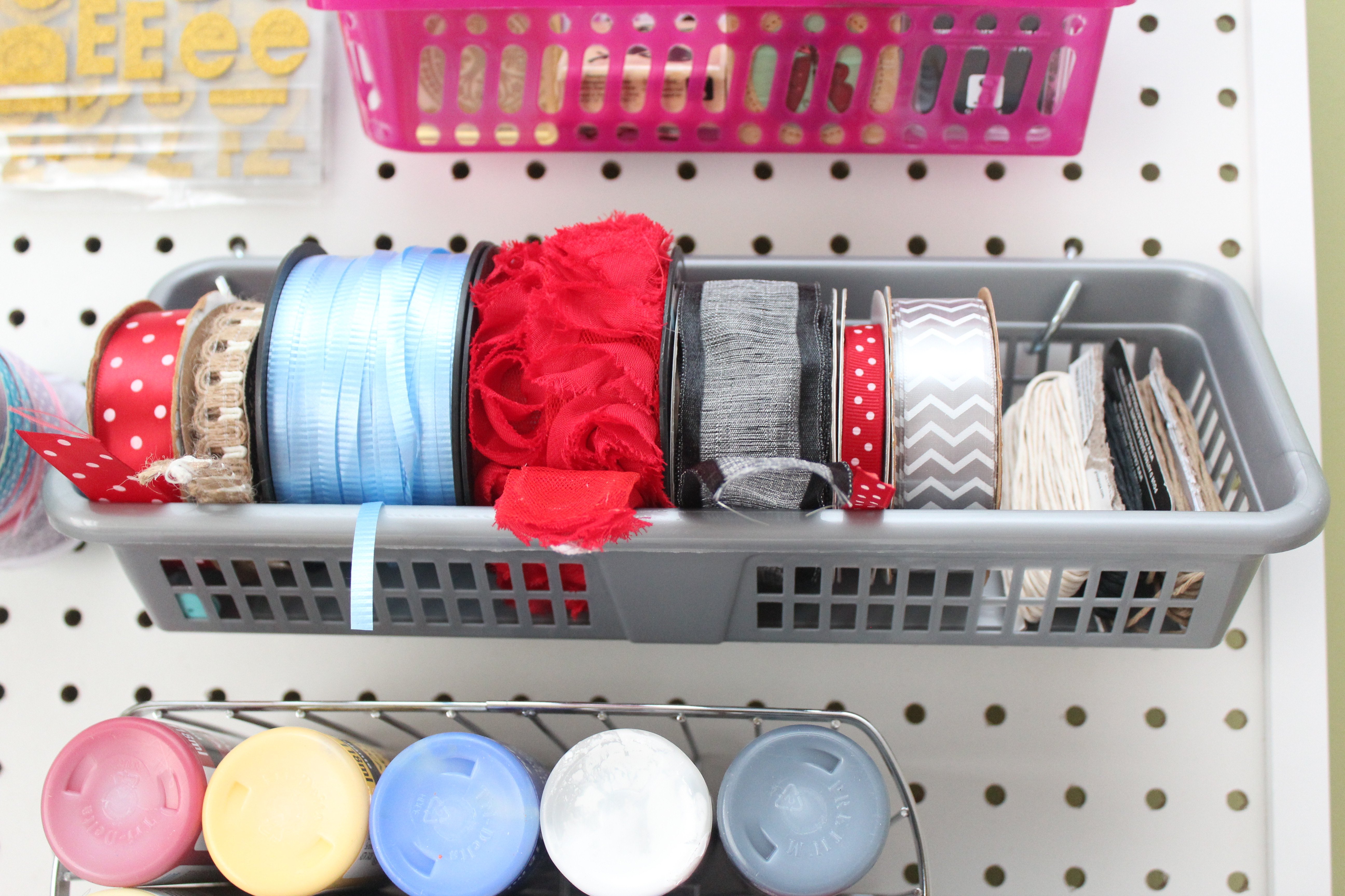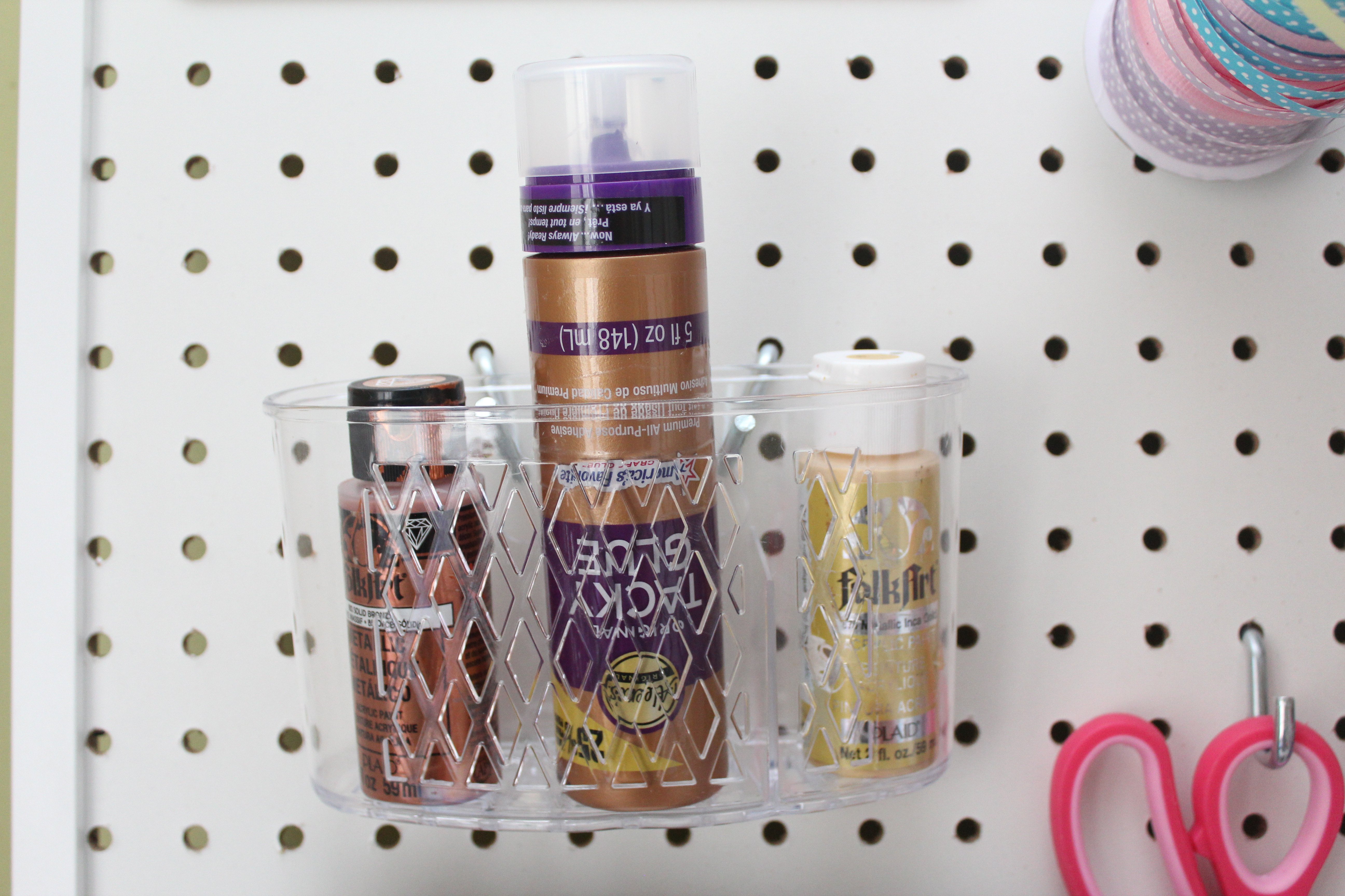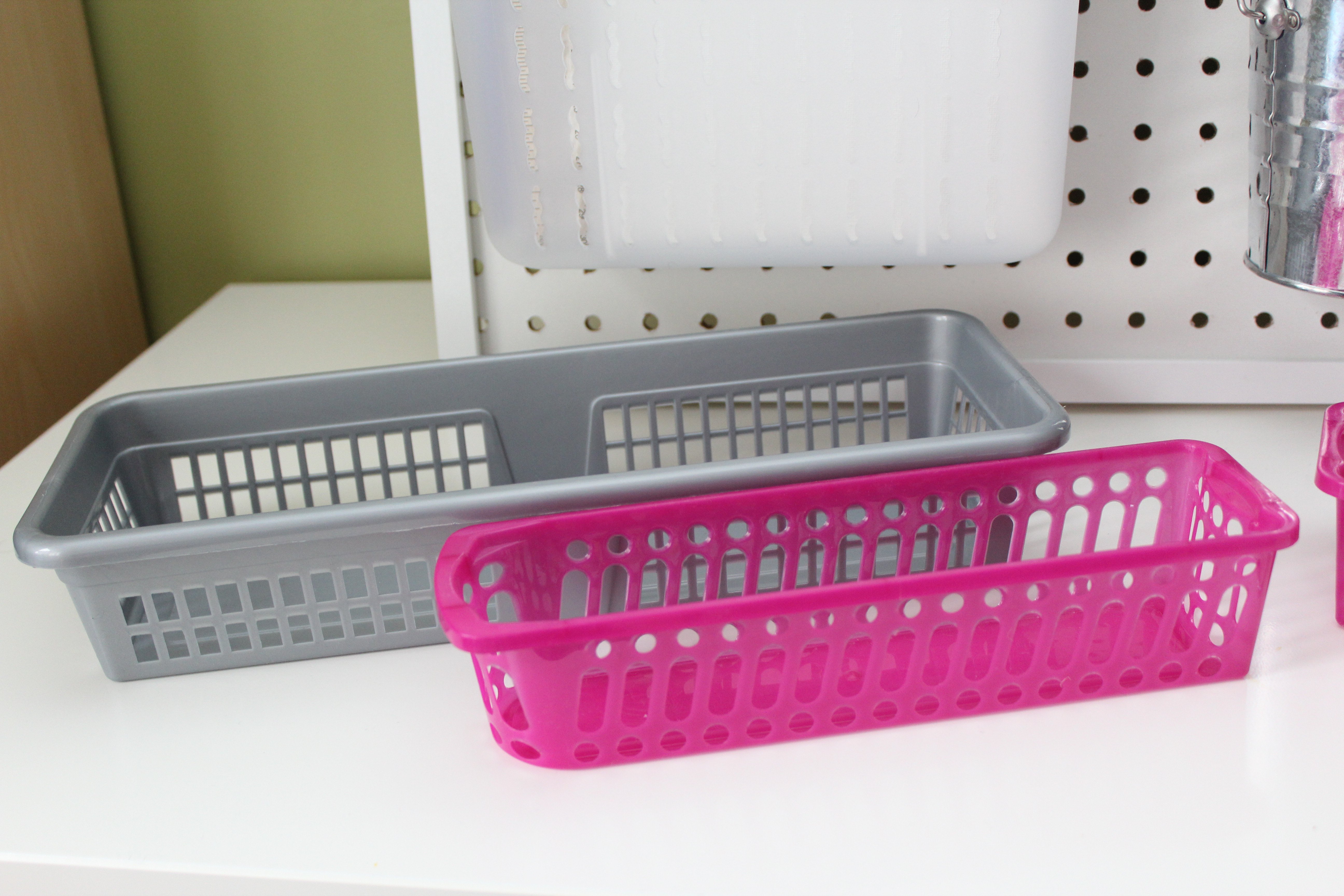 You can use the pegboard hooks for things like cricut tools and scissors, but for things like, paint bottles, paper, and other nick nacks, you’ll need some baskets and holders. To save money I scoured the Dollar store Home section for items I could use to organize with.