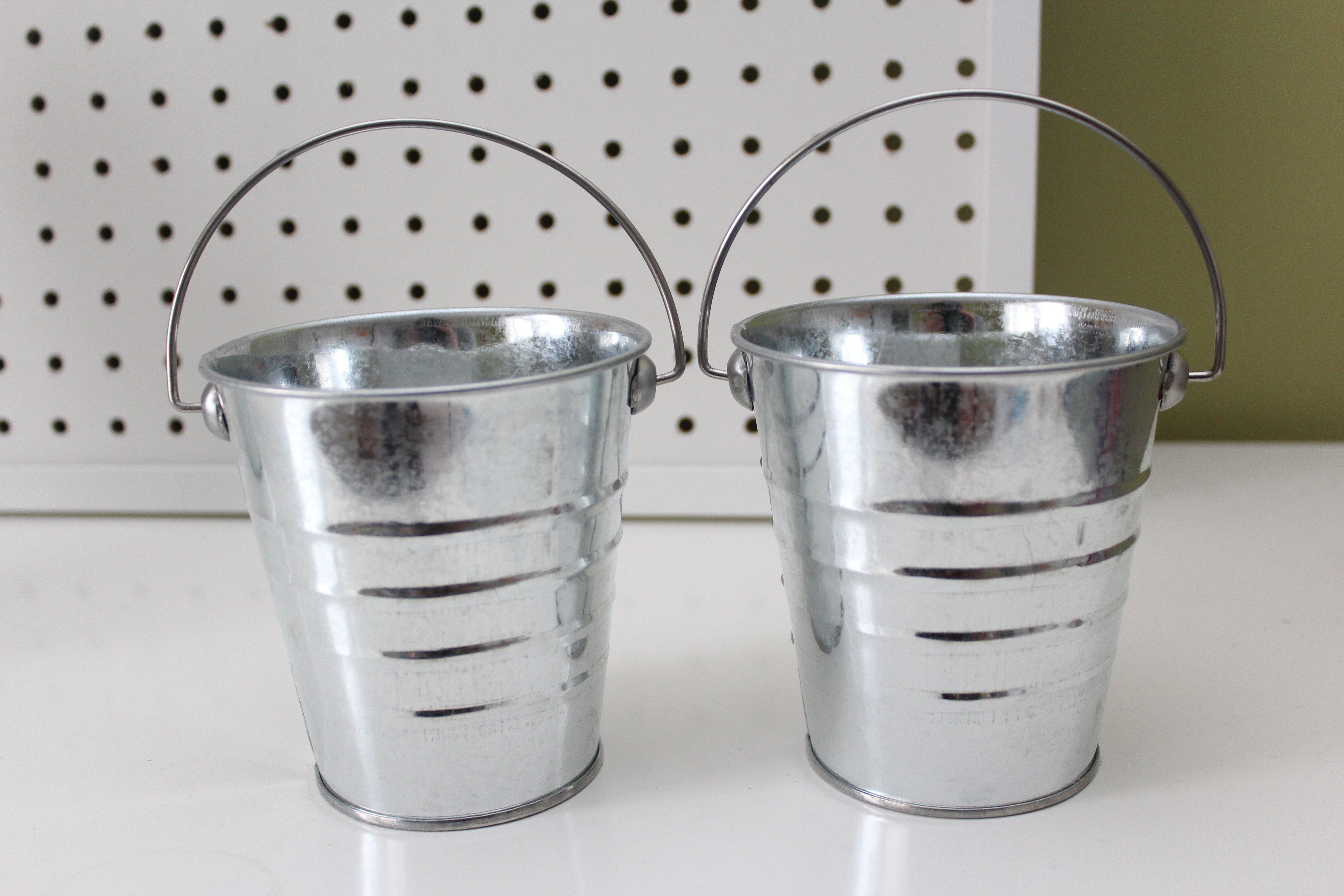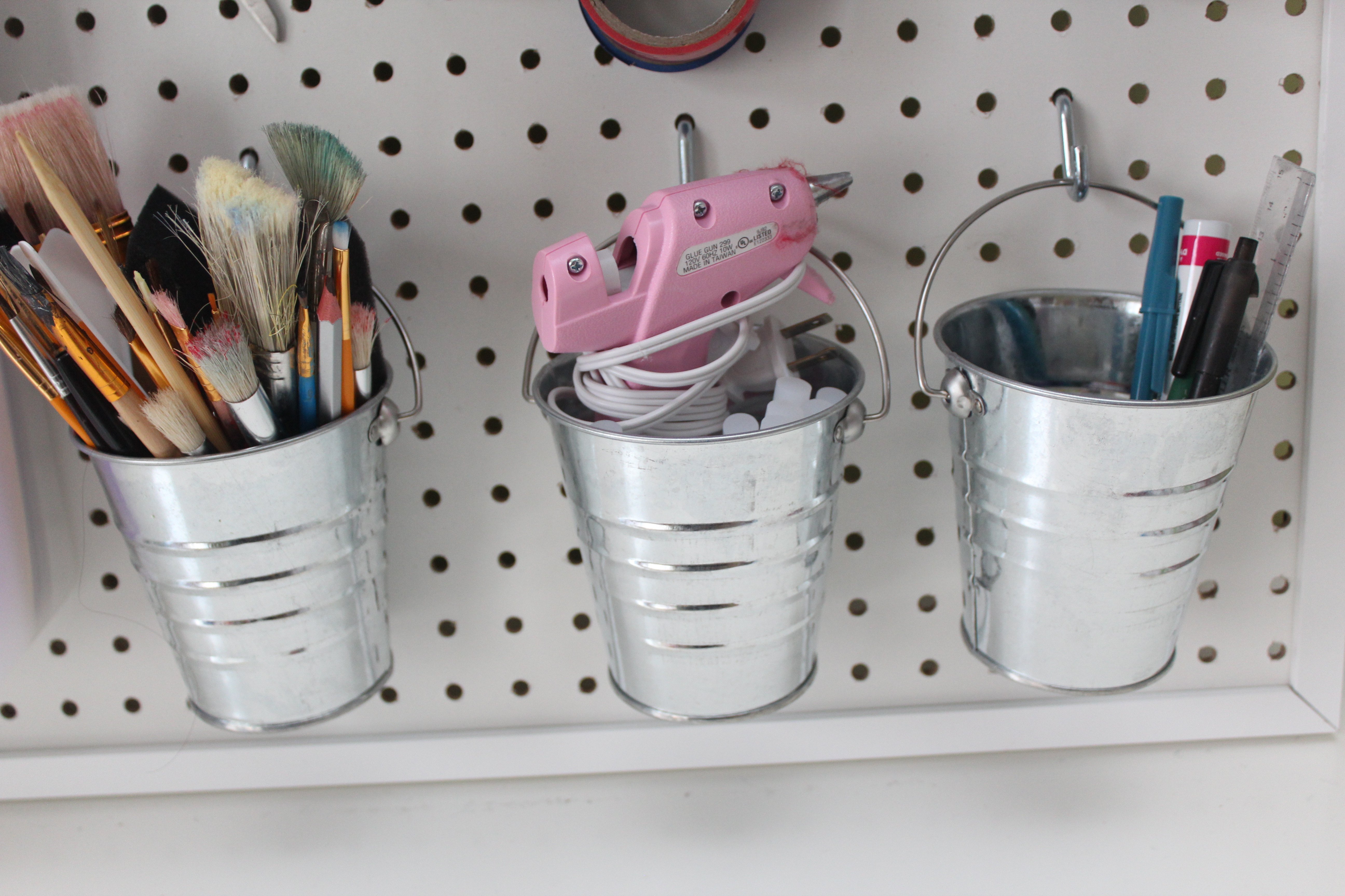We found galvanized tin buckets with handles that hung perfectly in place. The buckets are perfect for items like paintbrushes, markers, glue gun, glue sticks, pencils, etc..