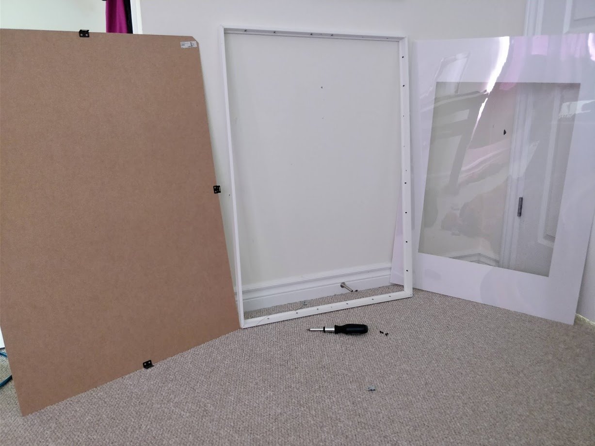 - Take your Ikea Ribba Frame, and take out the original backing, photo matting, and plexi glass protector. The only thing you need for this project is the hollow frame