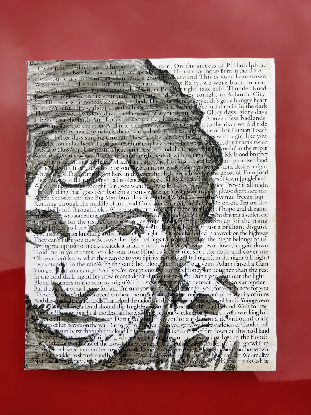 This Bruce Springstein watercolor (lyric) portrait art is painted with black and white watercolors, on top of printed lyric songs – which was sealed onto wooden canvas board.