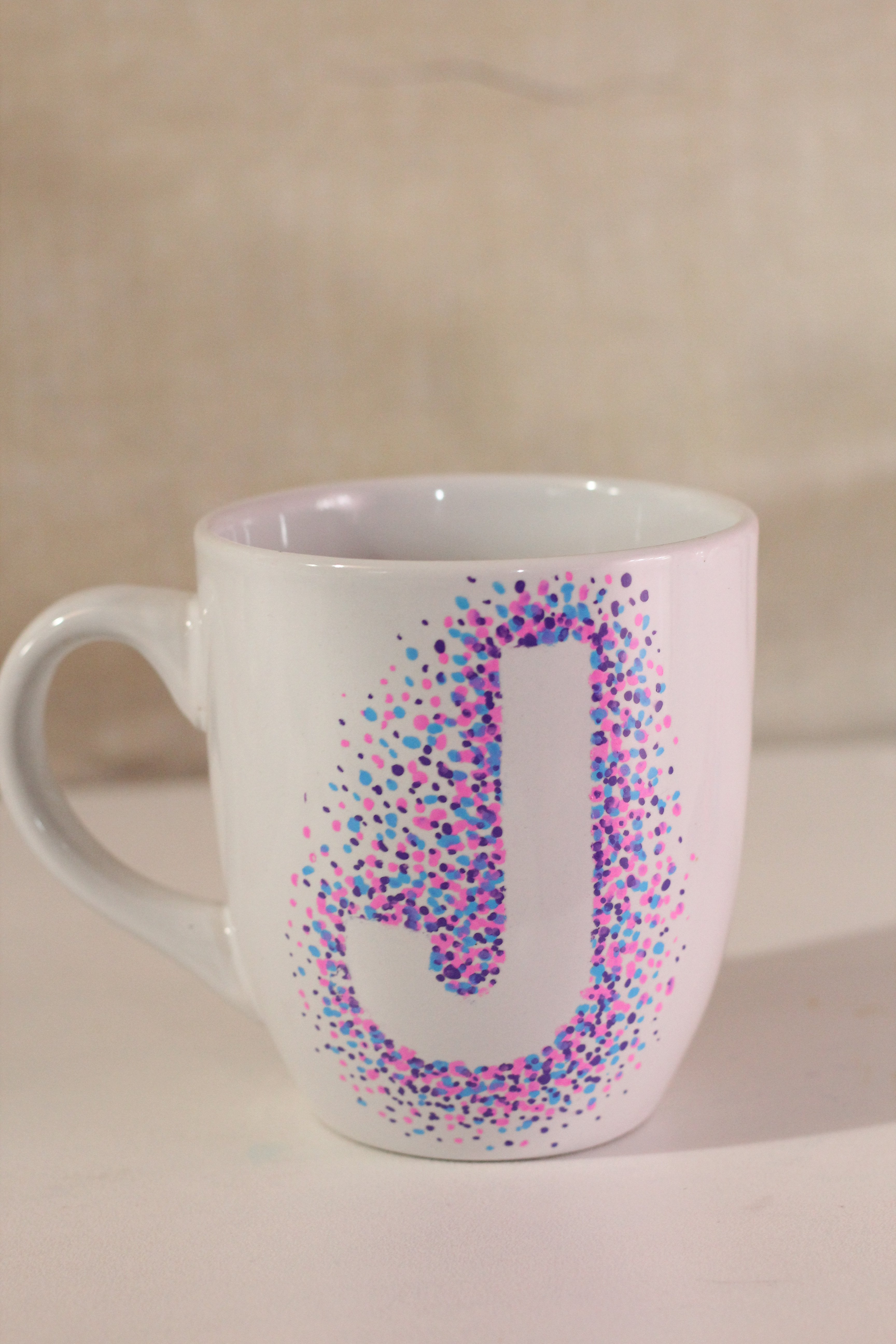 The secret to getting the shape/letter looking perfect is: using stickers (like the “J” sticker above) or contact paper! With the contact paper, you can cut out customized shapes and letters, peel and stick them to your mug before you begin.