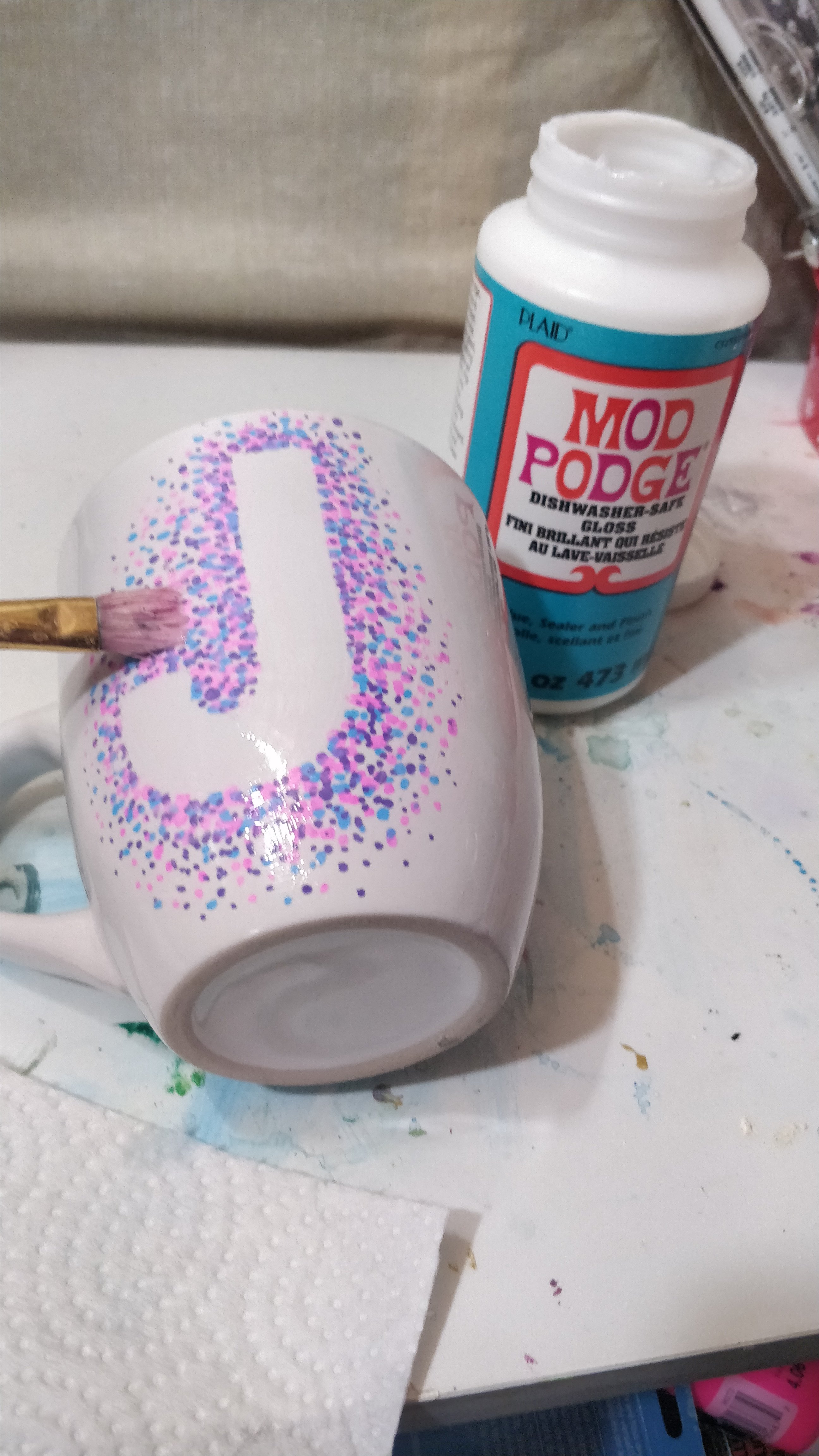 - Apply a thin coat of Mod Podge over the entire ceramic mug, in one direction.